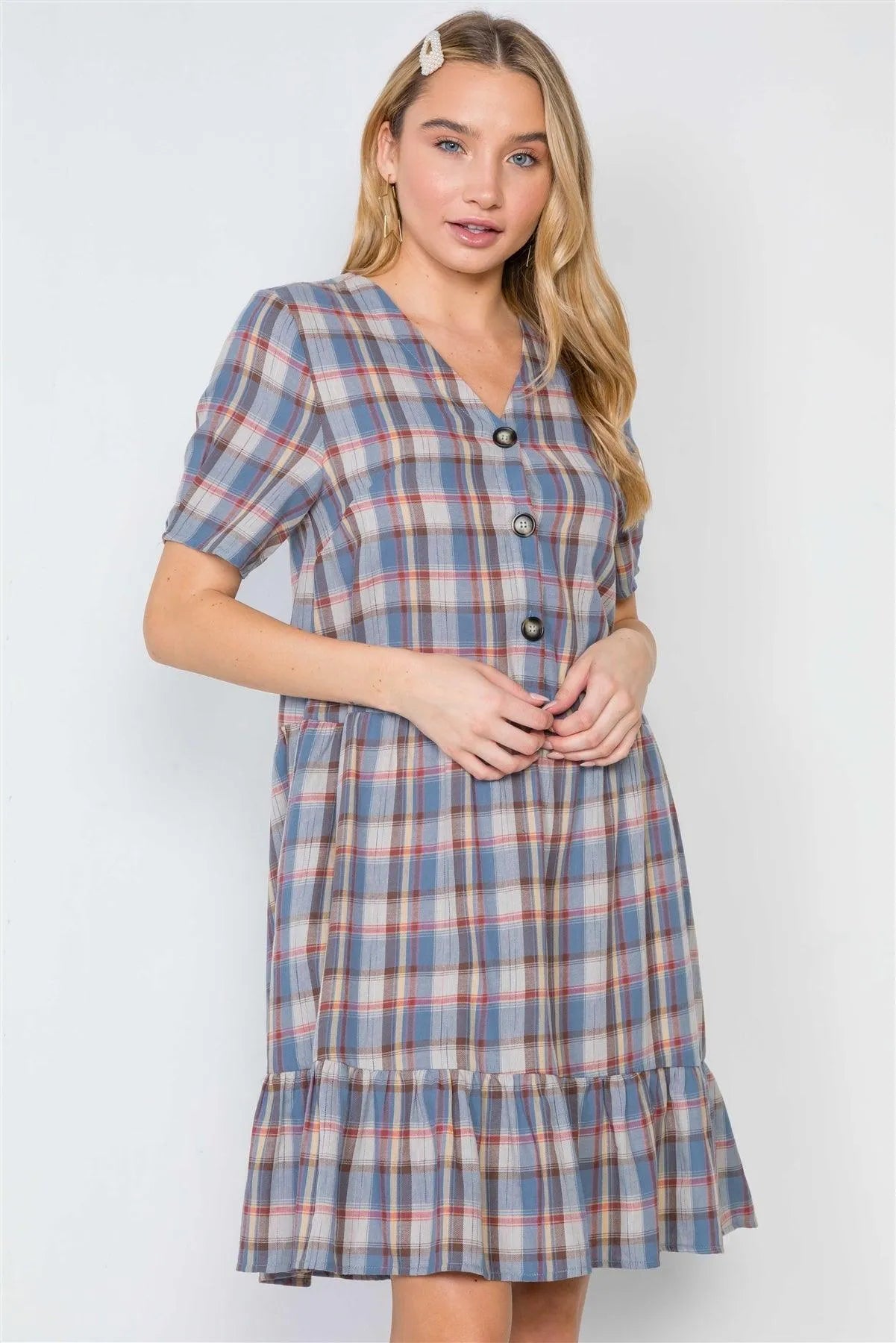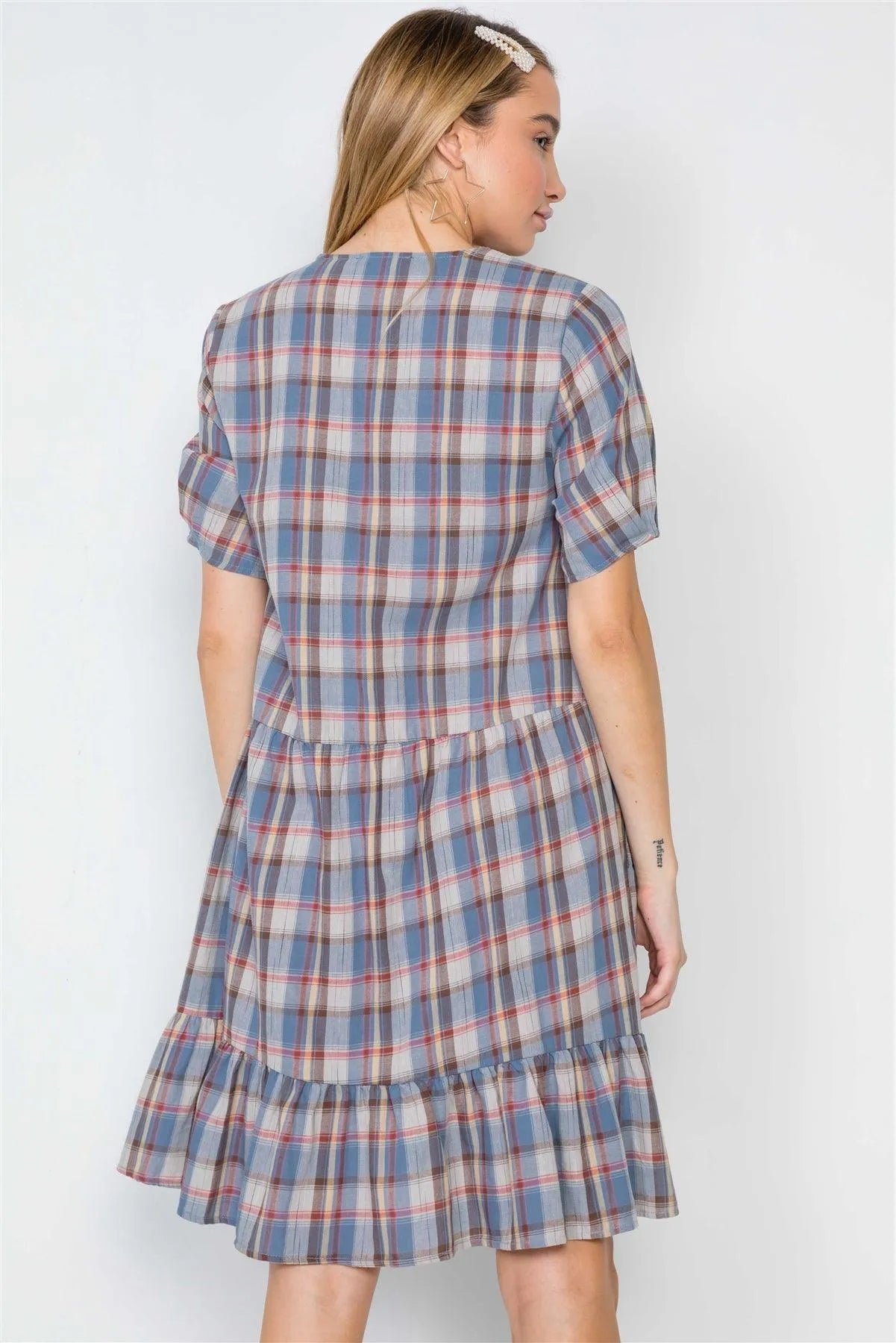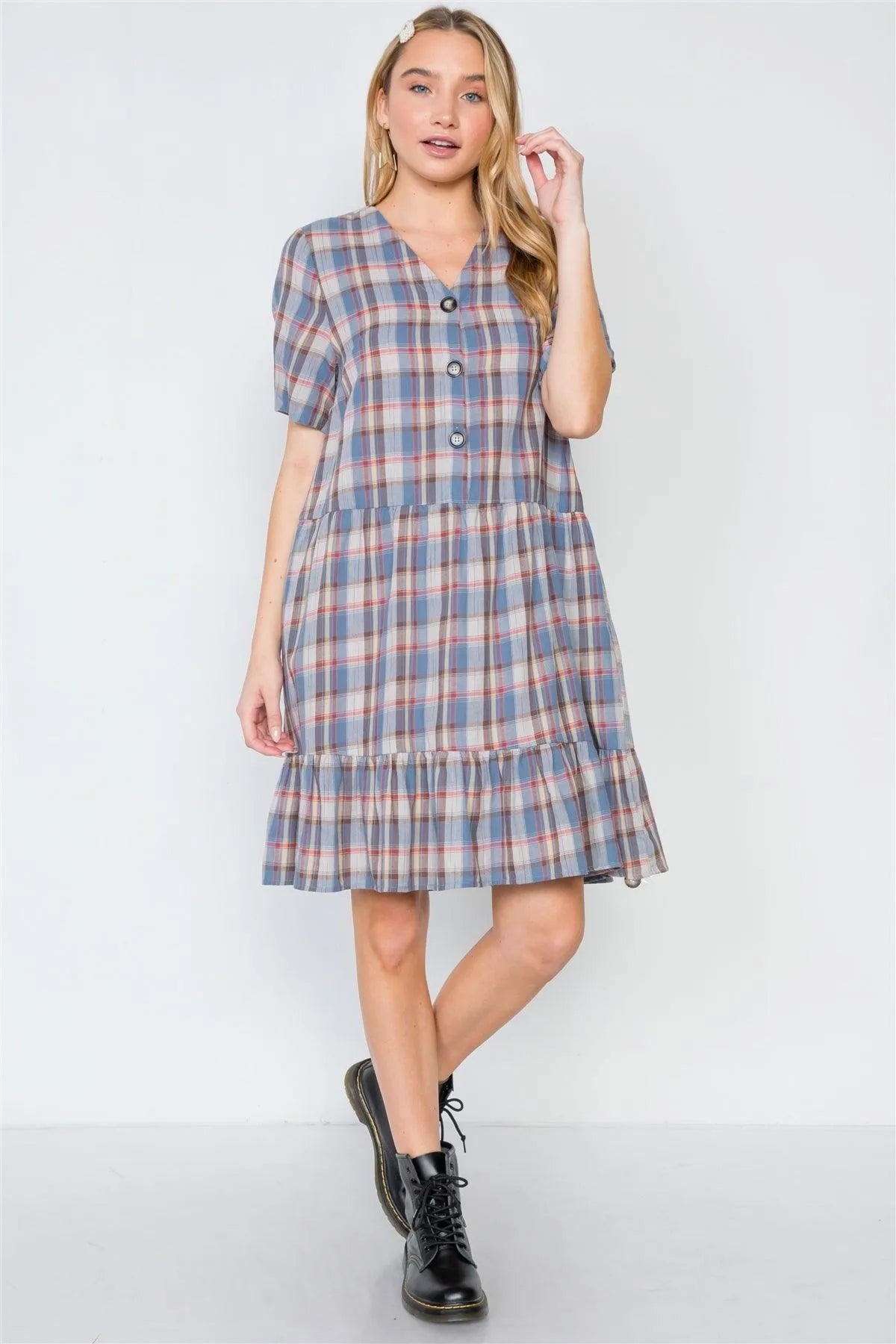 Multi Blue Plaid Short Sleeve Shirred Hem Dress /2-2-2