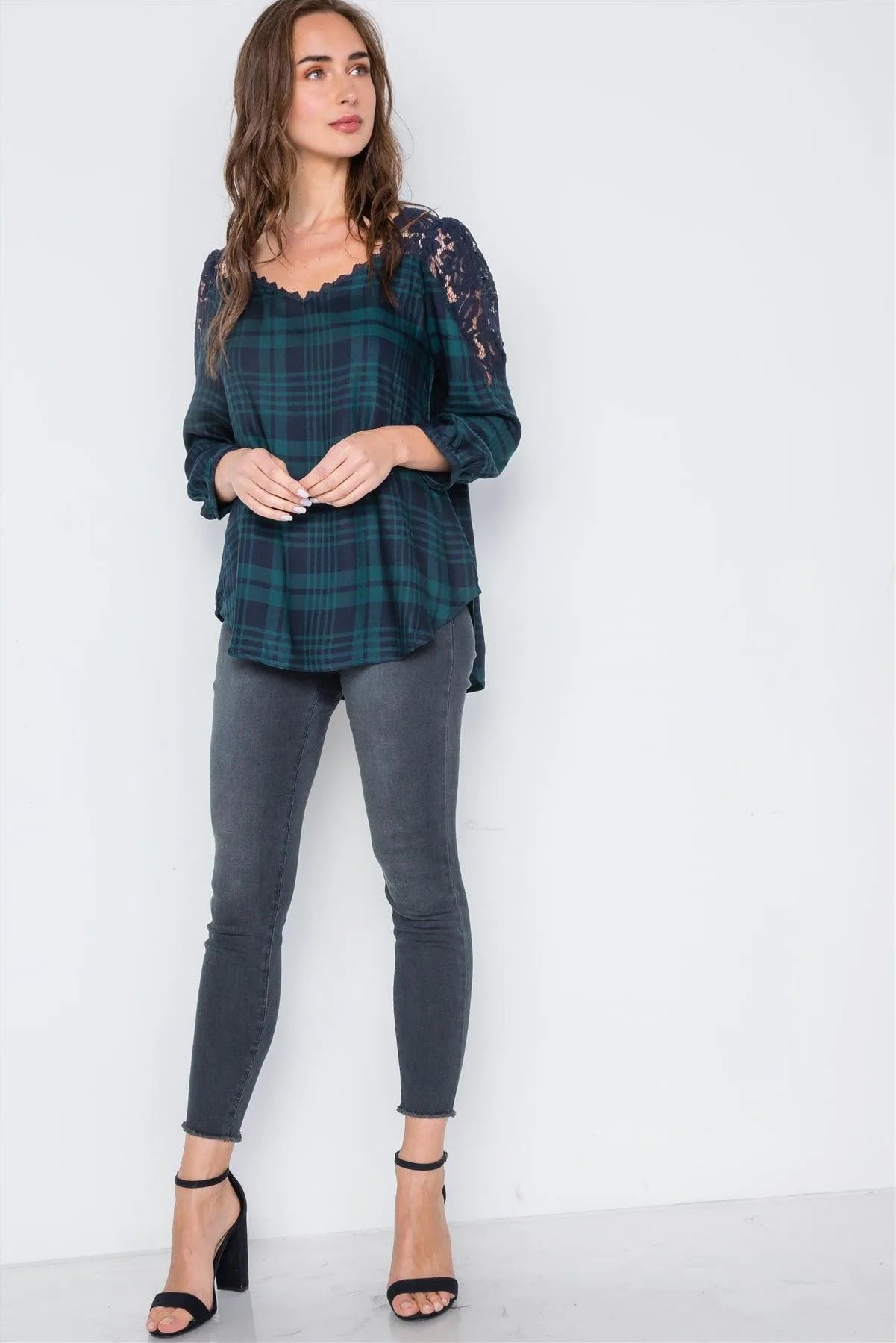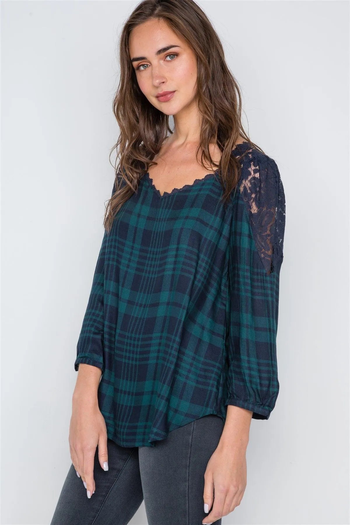 Multi Green Plaid Combo Lace 3/4 Sleeve Top /1-2-1