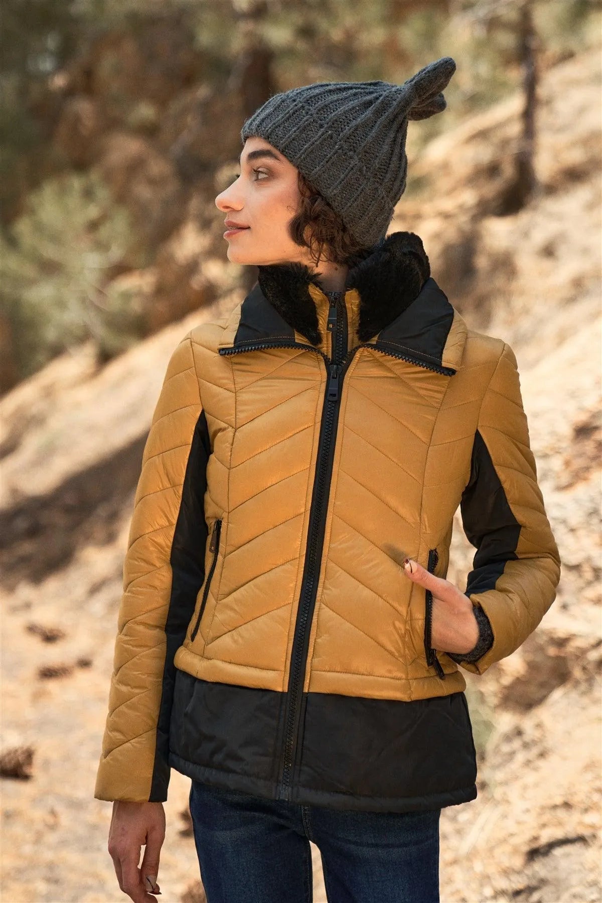 🖤 Item Features: Mustard & black, puffer jacket, combined, long sleeve, black contrast details on sleeves and hem, high neck lined fuzzy faux fur for extra warm, chevron quilted padded design, front double zip-up, side zipper pockets, regular length, non-stretch, fitted, winter sports attire, trendy design, activewear, snowboard and skiing outfit, cute and com