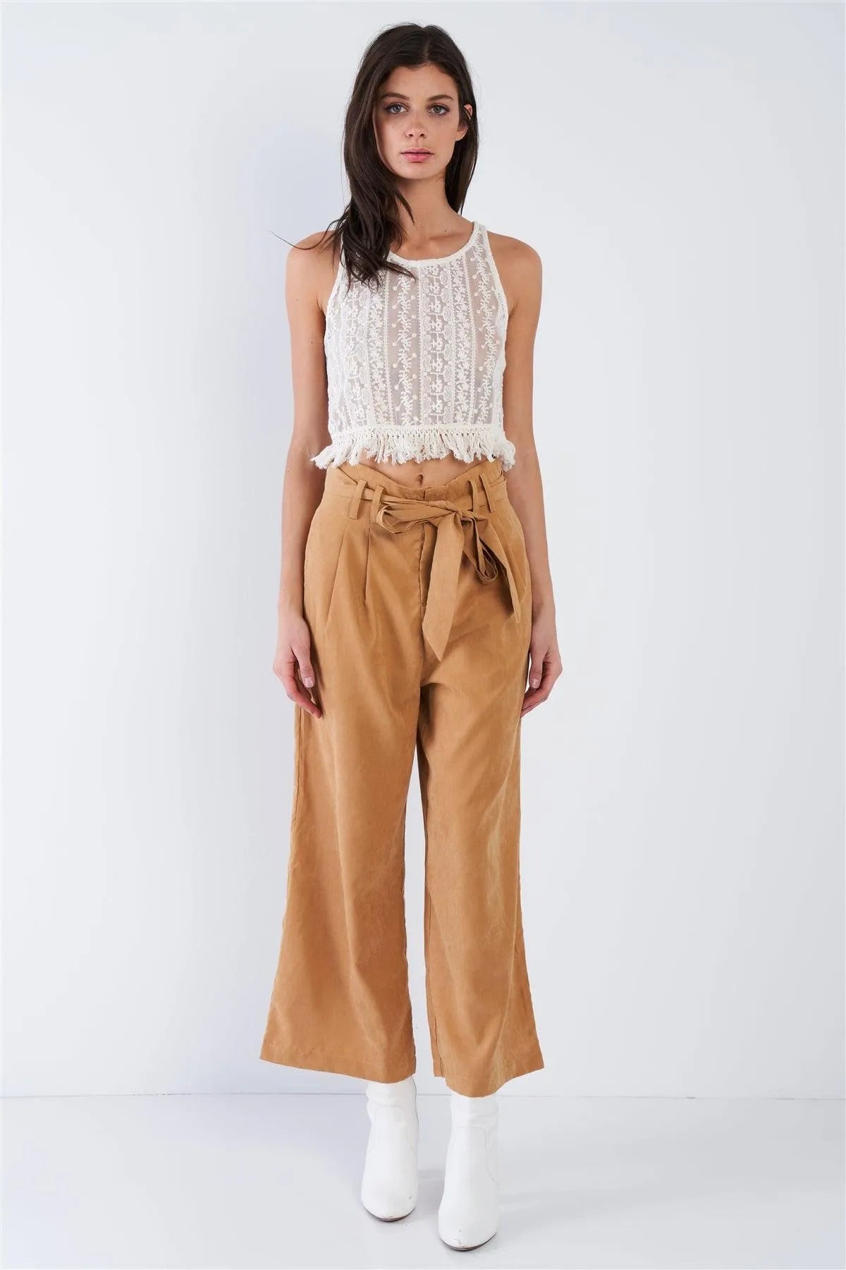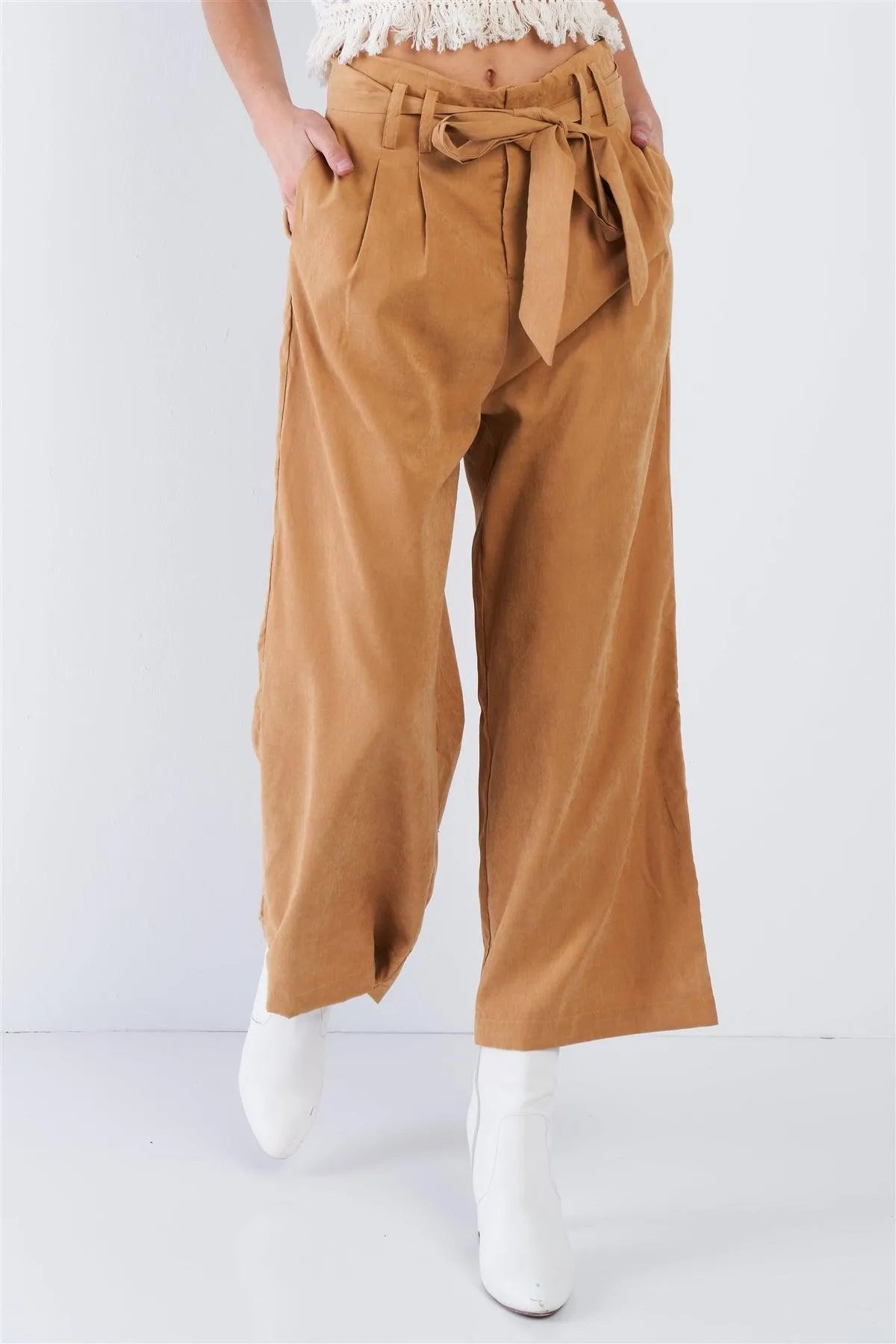 Pant features: solid, chic, vintage, casual, soft suede, pleated, self waist tie, belt loops, front pocks, wide leg, unlined, stretchy.Model is 5'9 wearing a size Small ( Waist: 23.5", Bust: 32B, Hips: 36")Item Measurements: Length: 39", Waist: 28"Item comes pre-packed True to size