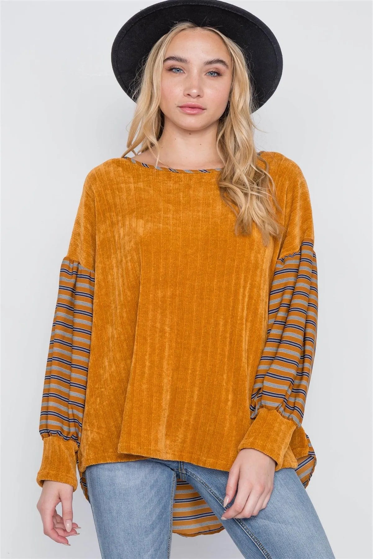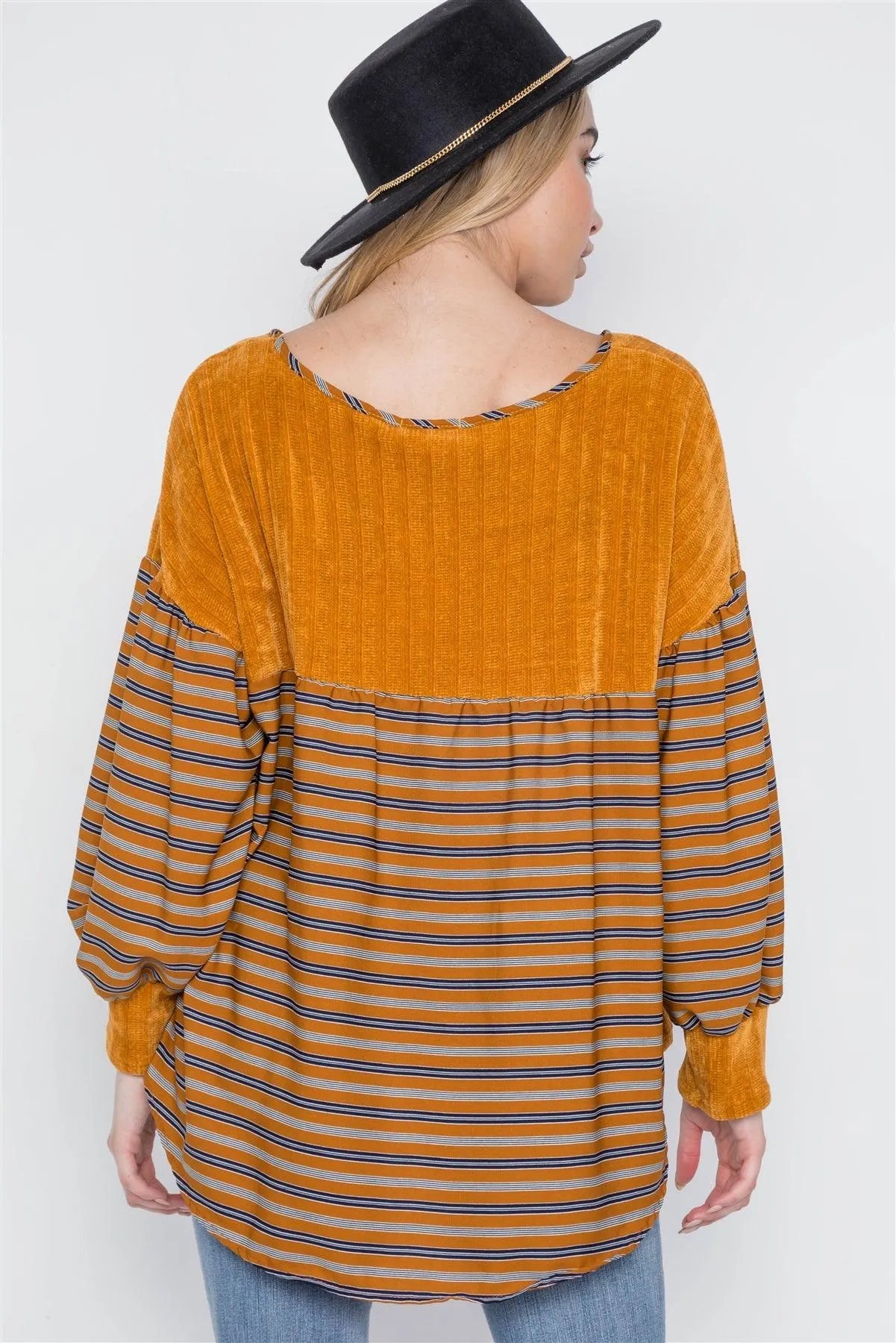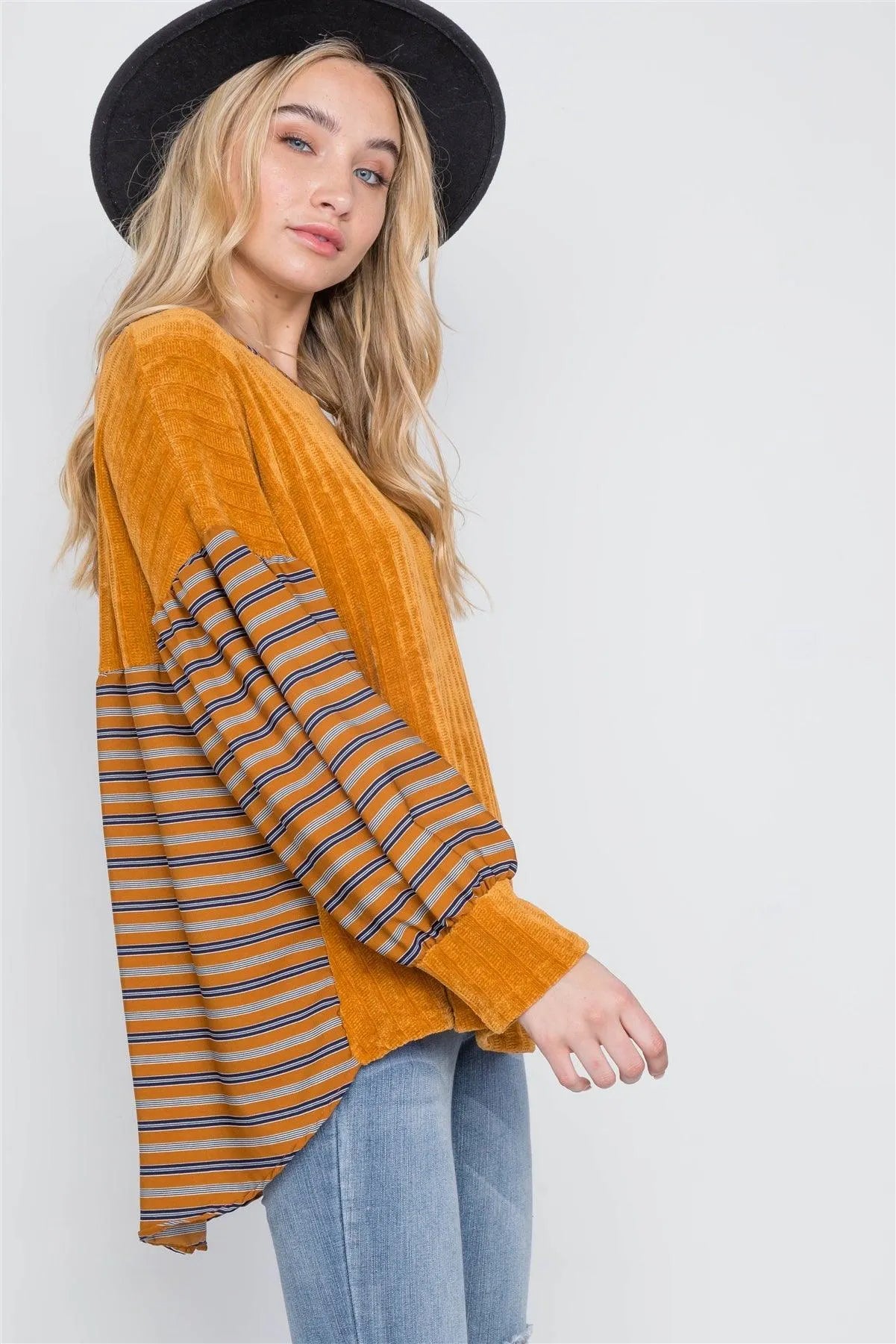 Mustard Long Sleeves Horizontal Stripes Top /2-2-2