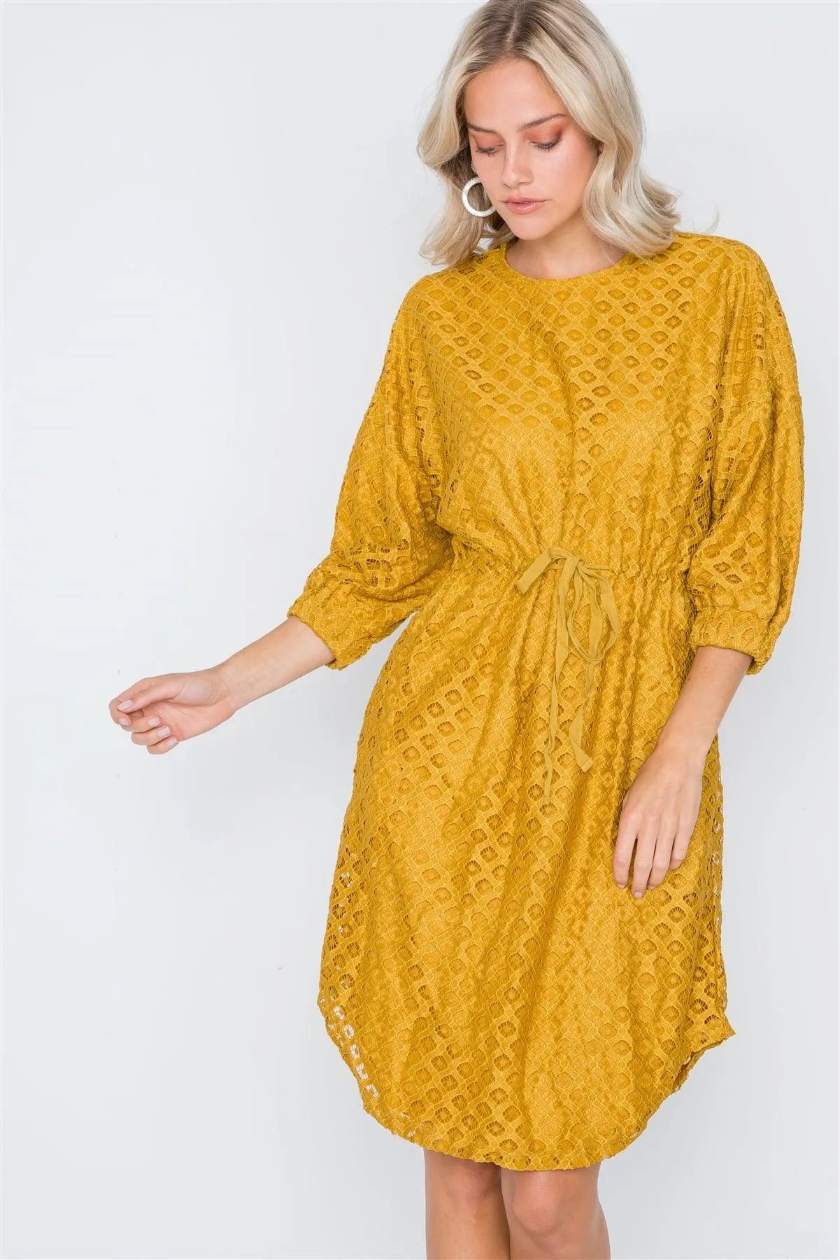 Mustard 3/4 Sleeve Patterned Lace Shift Dress /3-2-1
