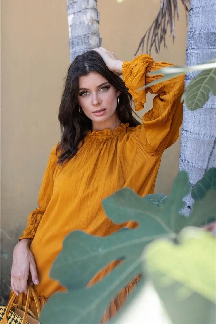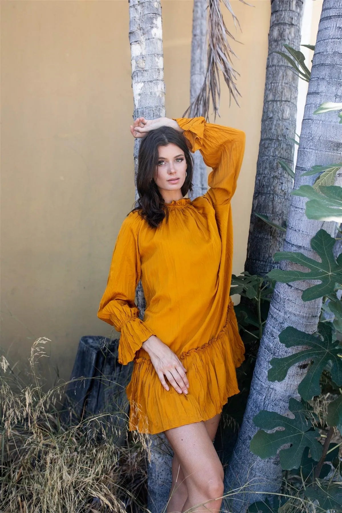 Mustard Wrinkle Pleat Mock Neck Long Trumpet Sleeve Dropped Waist Mini Dress /1-2-3