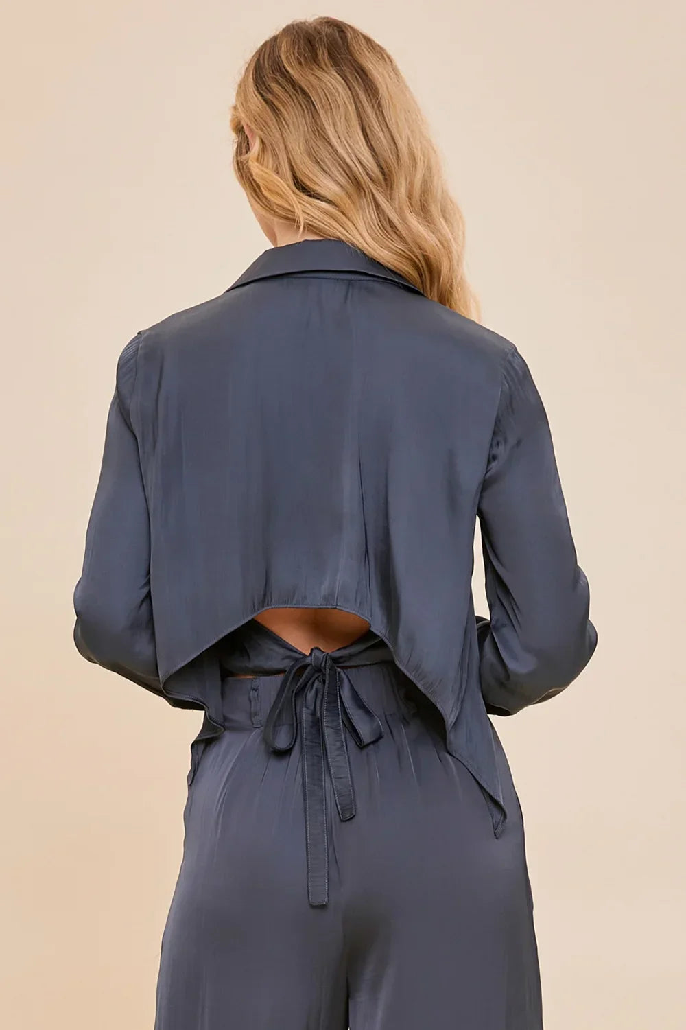 Black Tie Navy Dreams Cropped Satin Button-Up Shirt