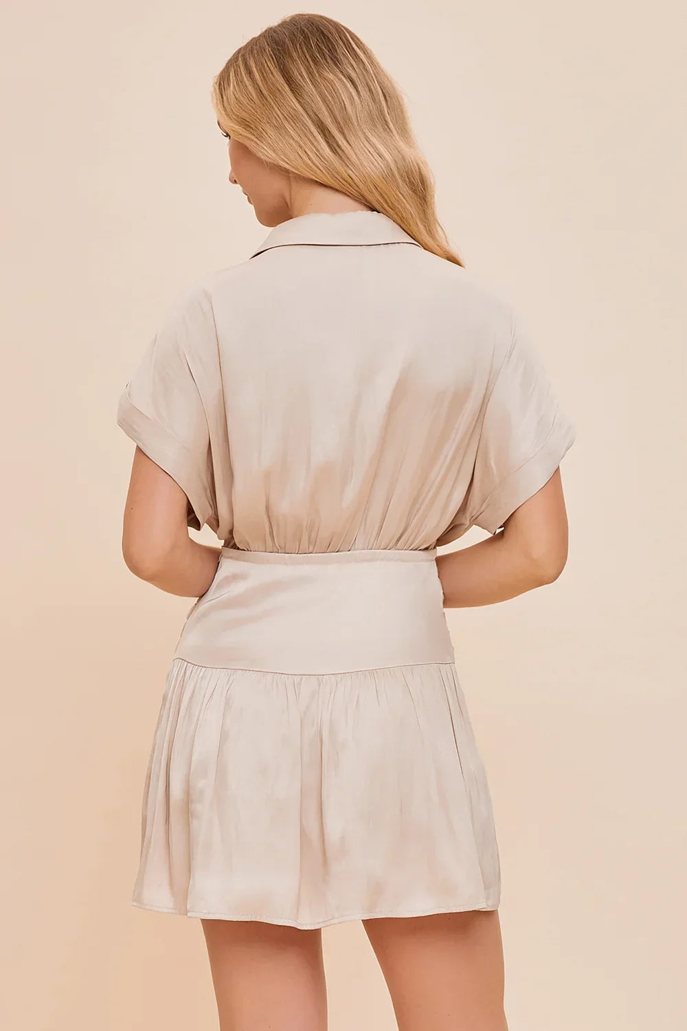 Embrace effortless sophistication with our Ruched Waist Shirt Dress. This stunning contemporary dress features a chic collar design, dramatic ruched waist detailing, and flattering mini silhouette that's perfect for your boutique's elevated and versatile collections. Crafted from premium lightweight fabric with short rolled sleeves and a tiered skirt hem, this gathered waist mini dress offers the perfect blend of comfort and modern feminine elegance that your customers will absolutely adore.
