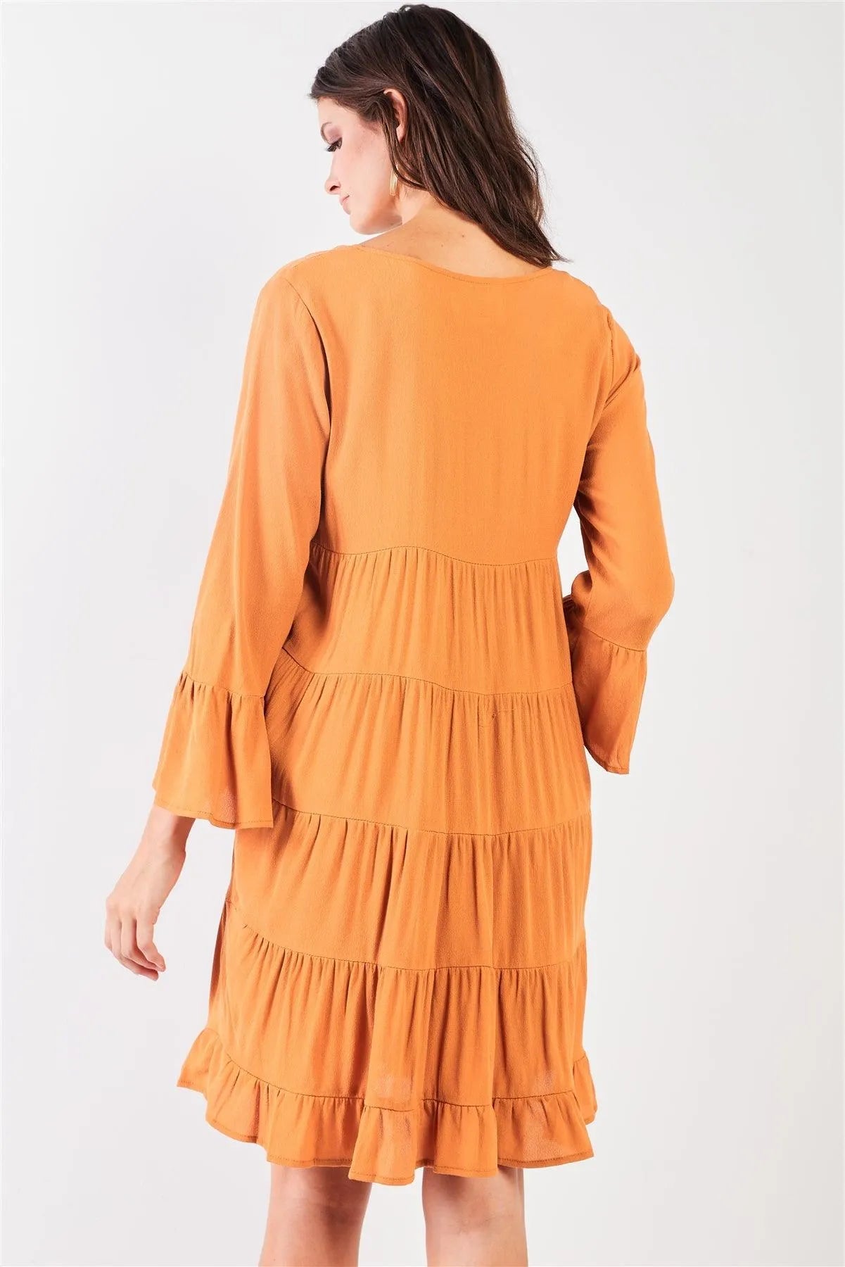 Boho Mustard V-Neck 3/4 Flare Sleeve High-Waist Knee Length Dress /2-2-2