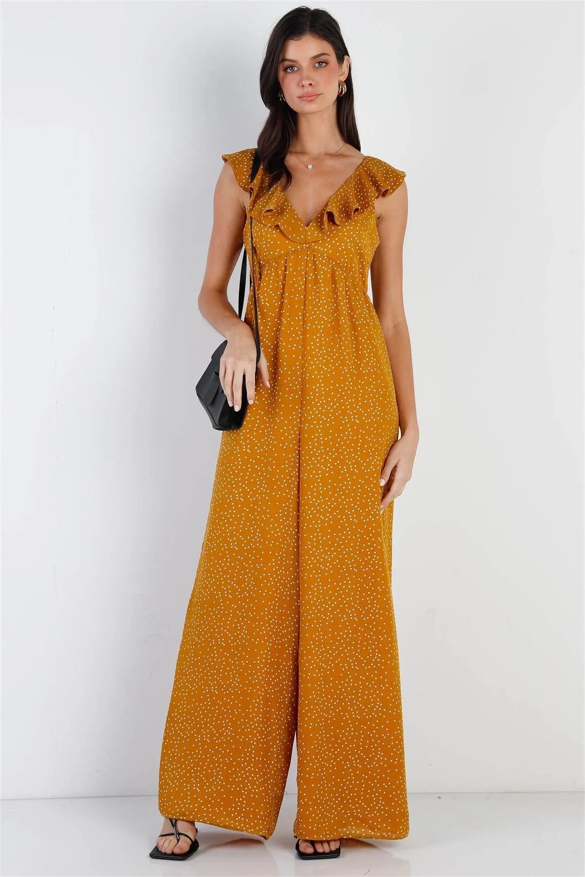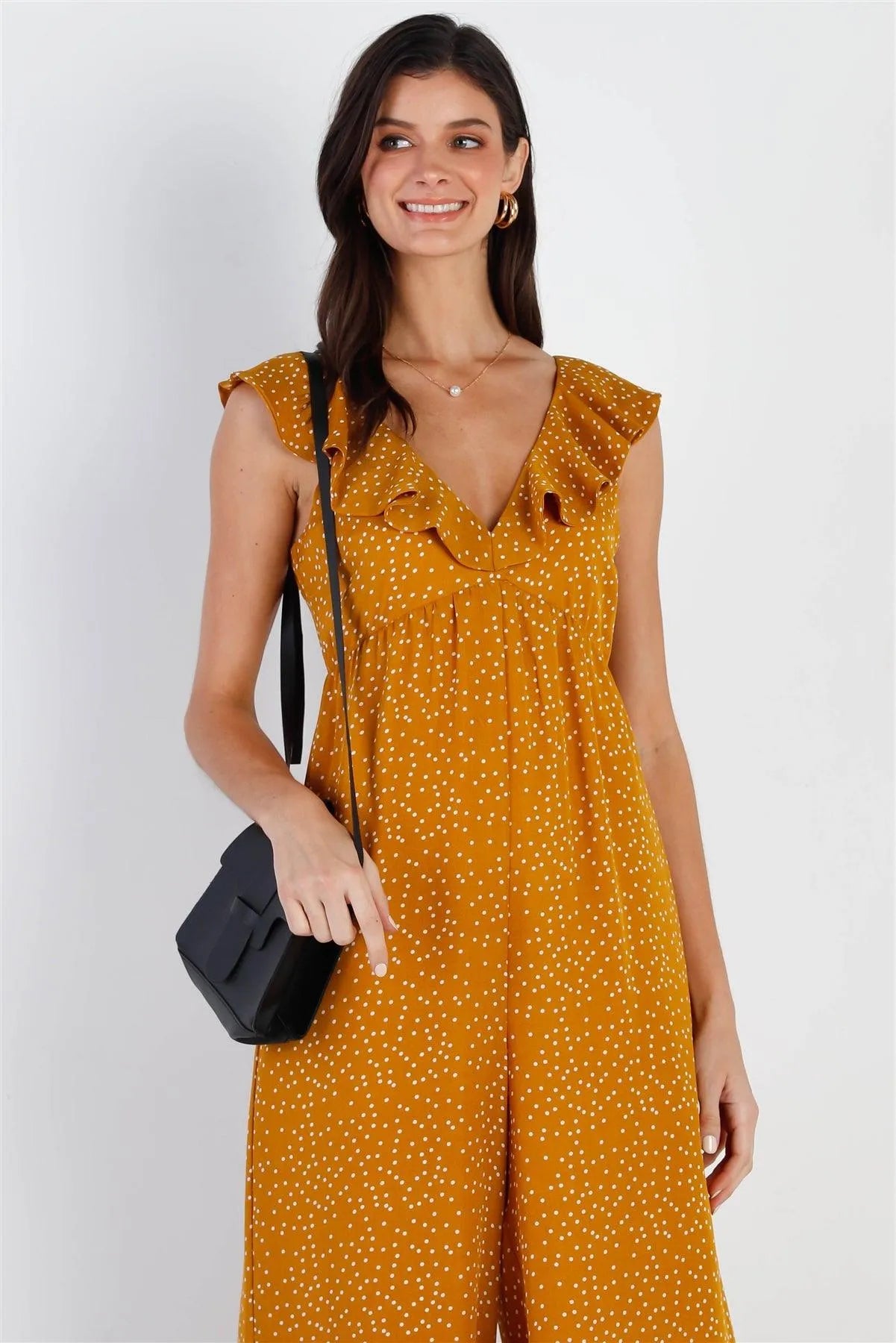 🖤 Item Features: Mustard & white, polka dot print, ruffle trim v-neckline, back lace up detail, sleeveless, wide leg pants, lined, non-sheer, non-stretchy, casual, cute, girlish, summer look