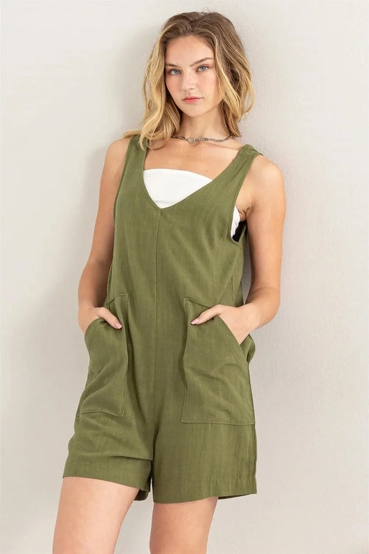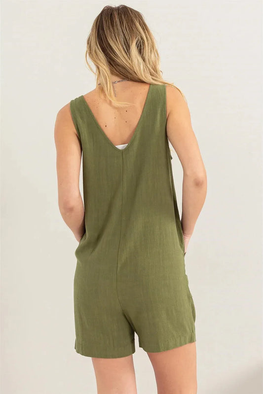 Linen Blend Button-Up Short Sleeve Belted Utility RomperVendor:HYFVE