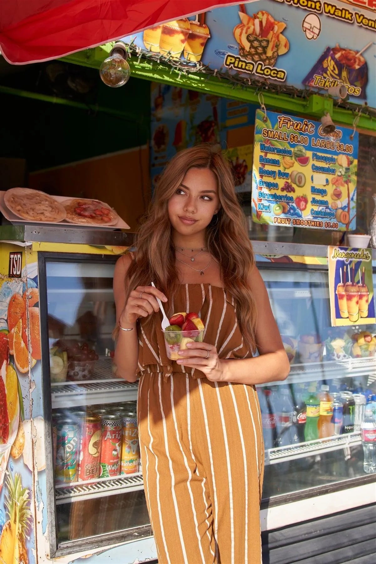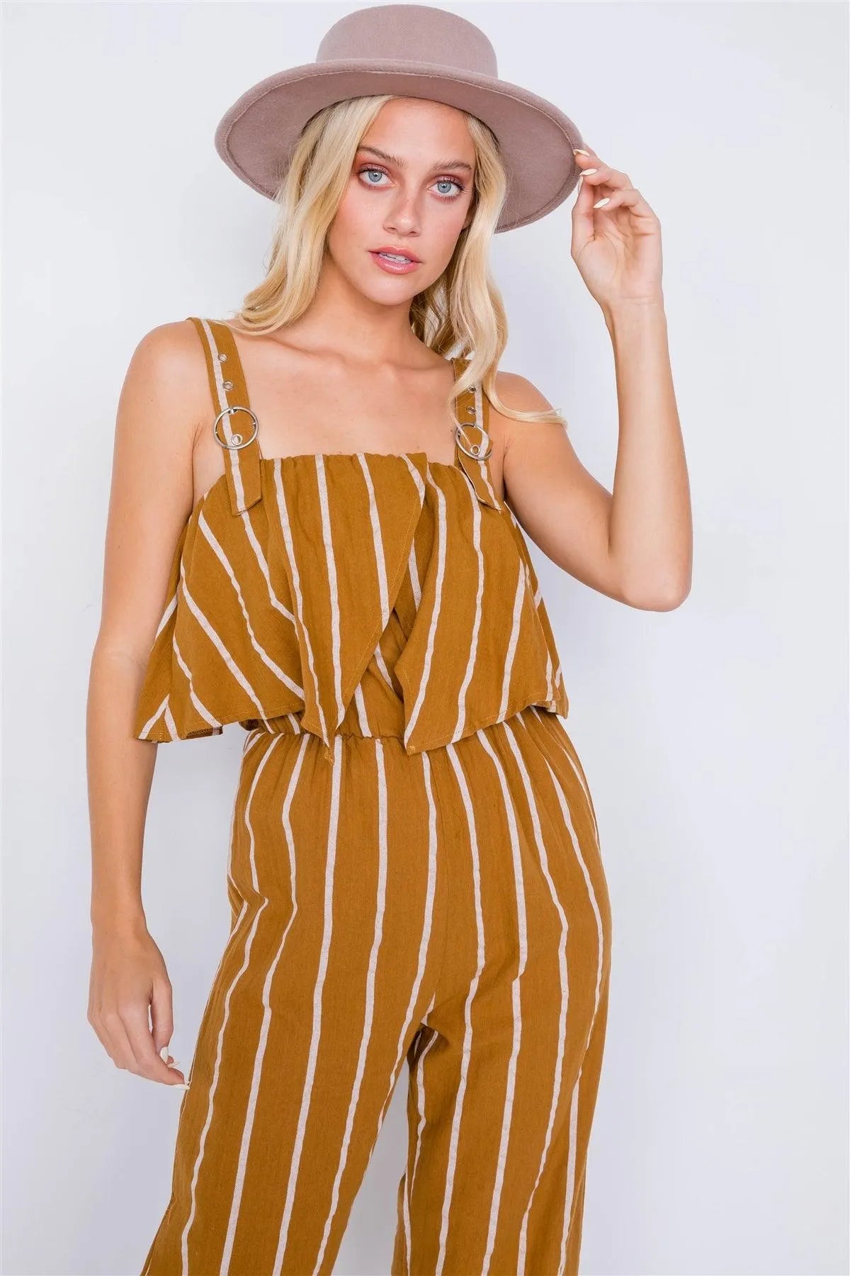 Mustard & White Stripe Buckle Shoulder Wide Leg Jumpsuit /1-2-3