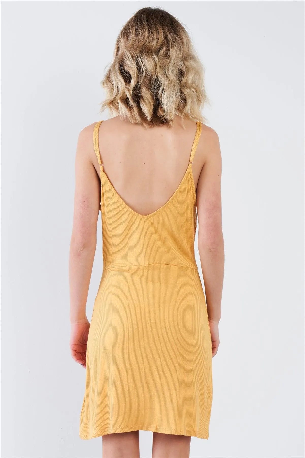 Dress Features: ribbed, v-neck, side mock button detail, solid, yellow mustard, chic, casual, adjustable cami straps, unlined, very stretchy.Model is 5'9 wearing a size Small ( Waist: 23.5", Bust: 32B, Hips: 36")Item Measurements: Length: 34" , Bust: 26"Item comes pre-packed True to size