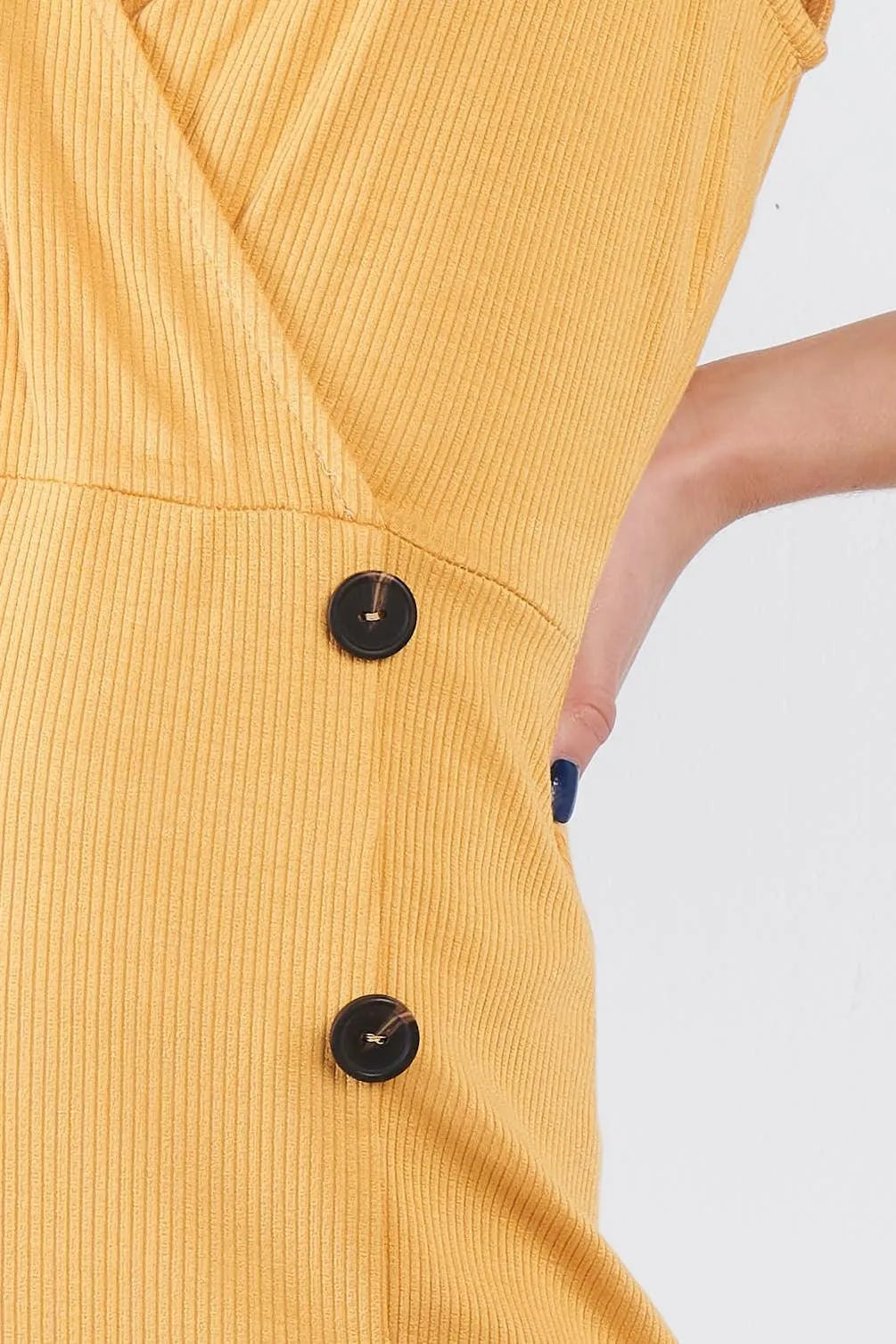 Mustard Yellow V-Neck Mock Side Button Casual Mini Dress /1-1-2-1