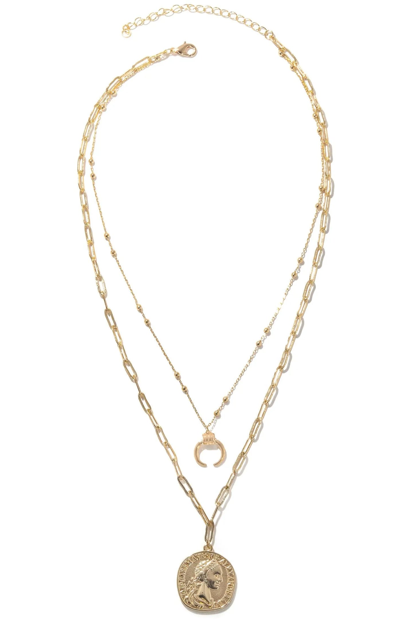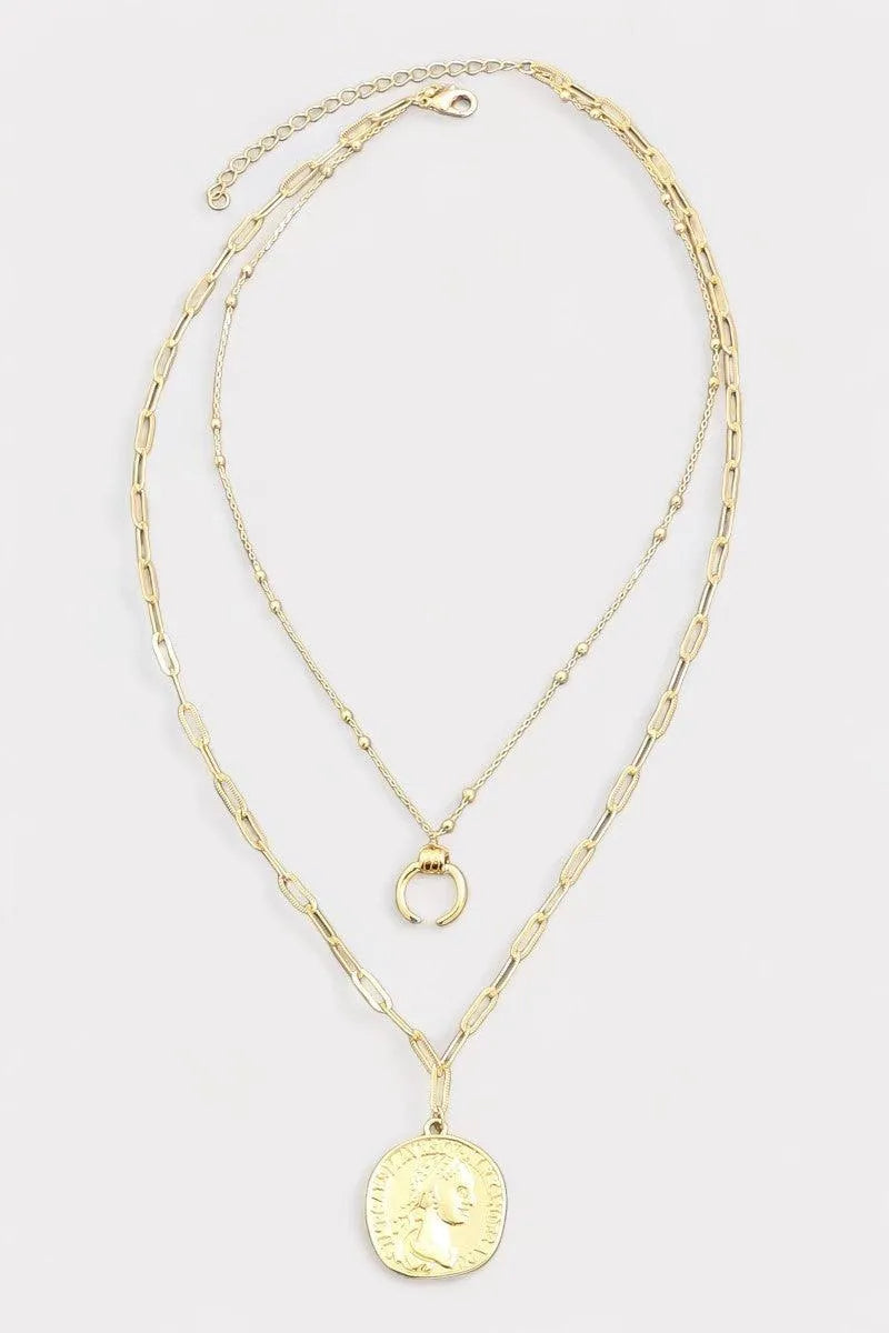 🖤 Item Feature: two layer, coin pendant with horn, metallic, lobster claw closure, boho, festival, cute, stylish, must have.