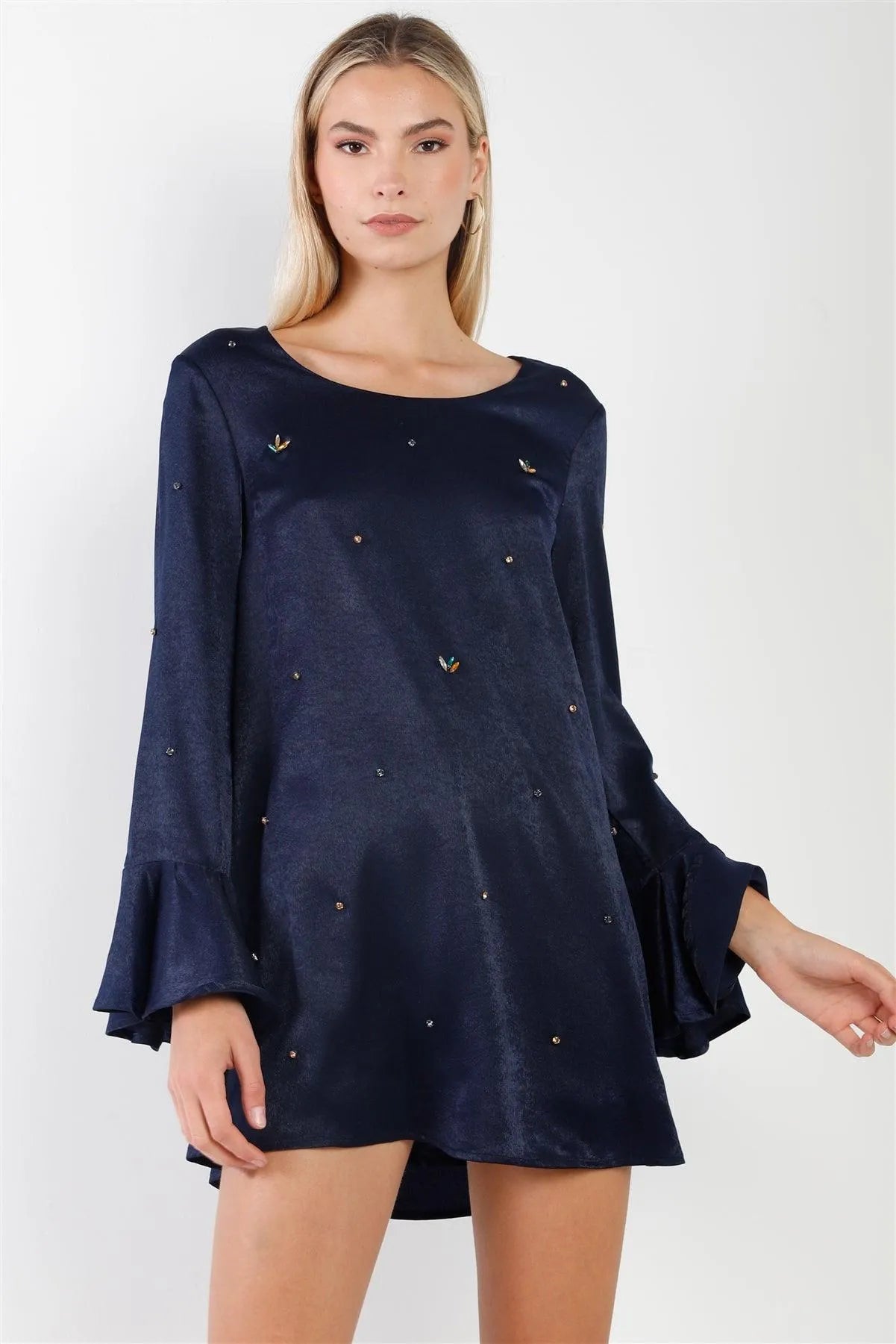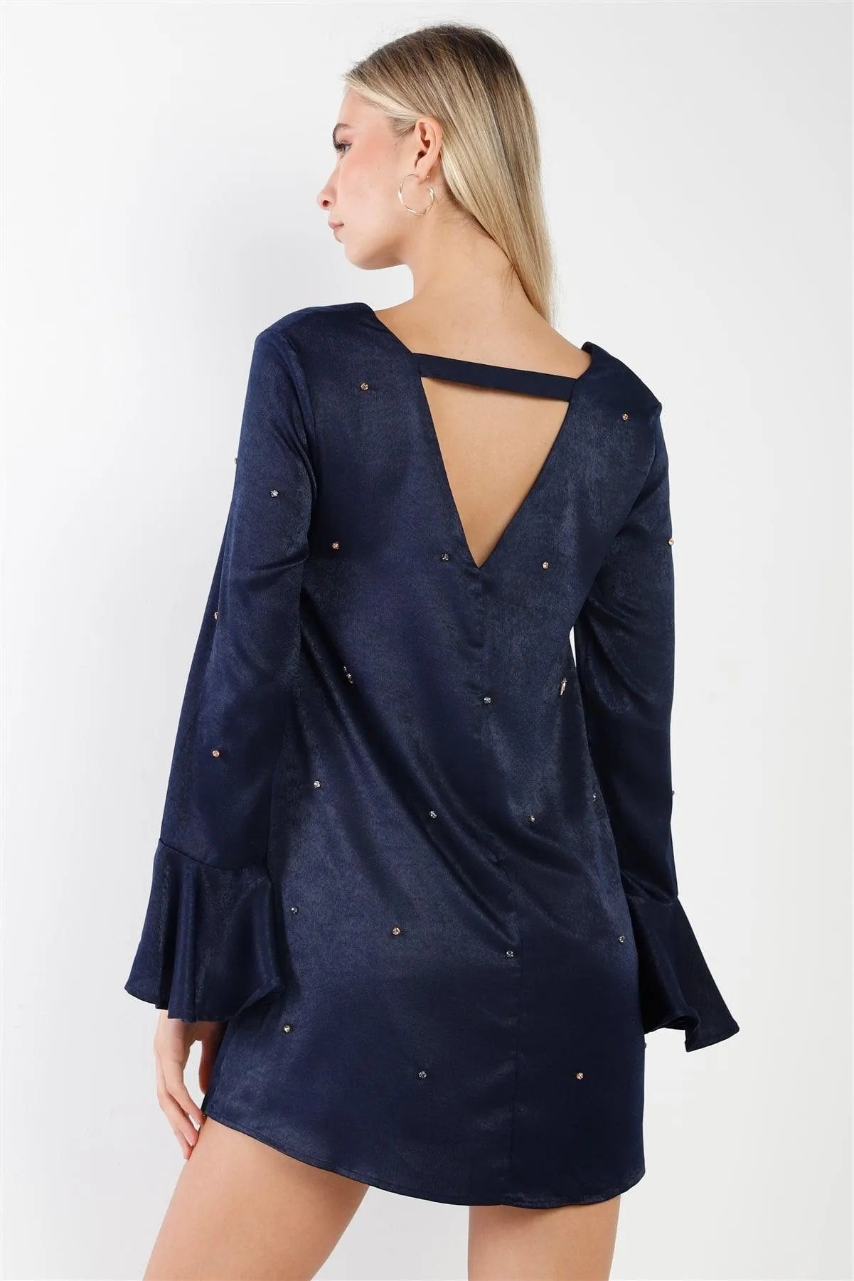 Navy Bell Sleeves Rhinestone Mini Dress /2-2-2