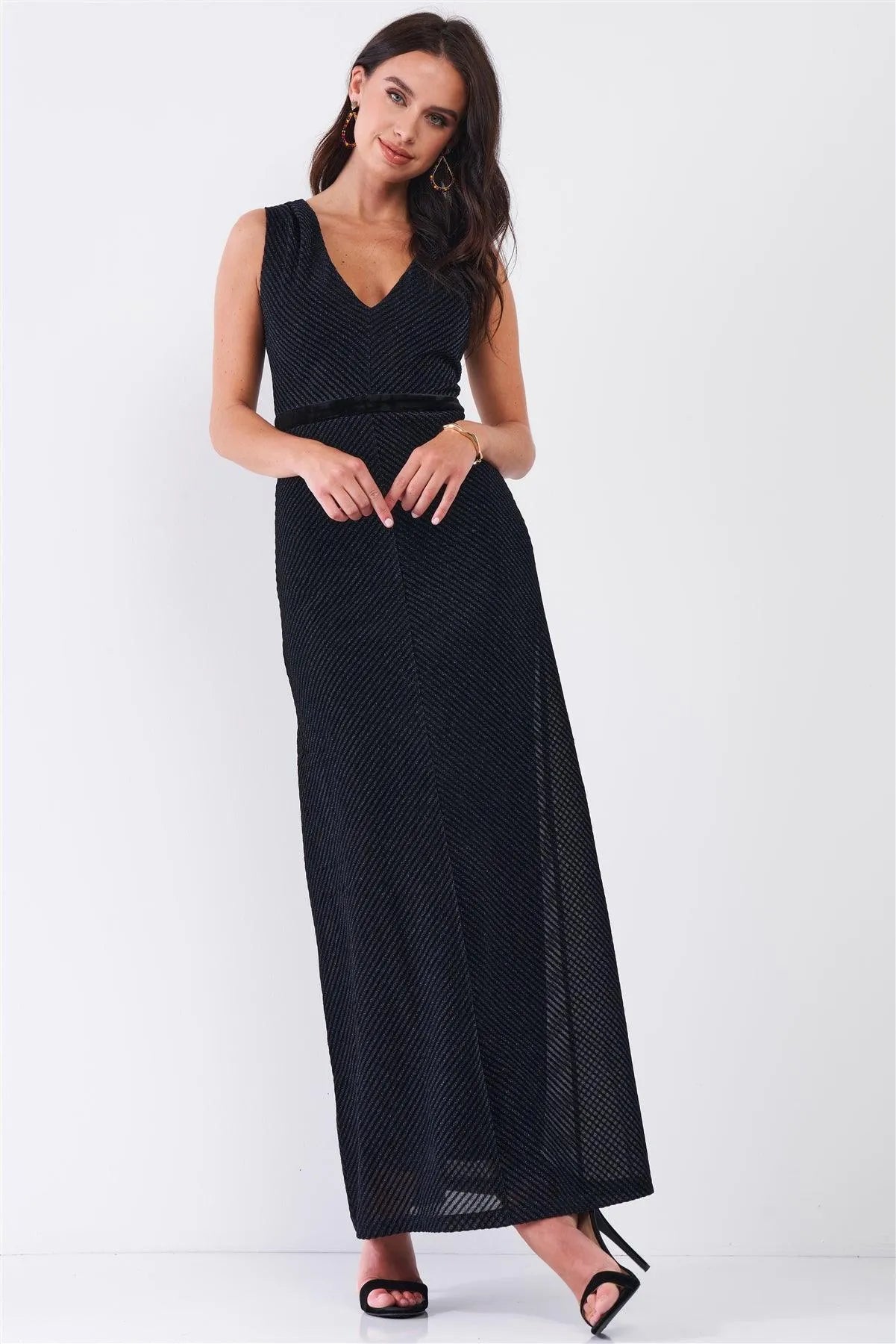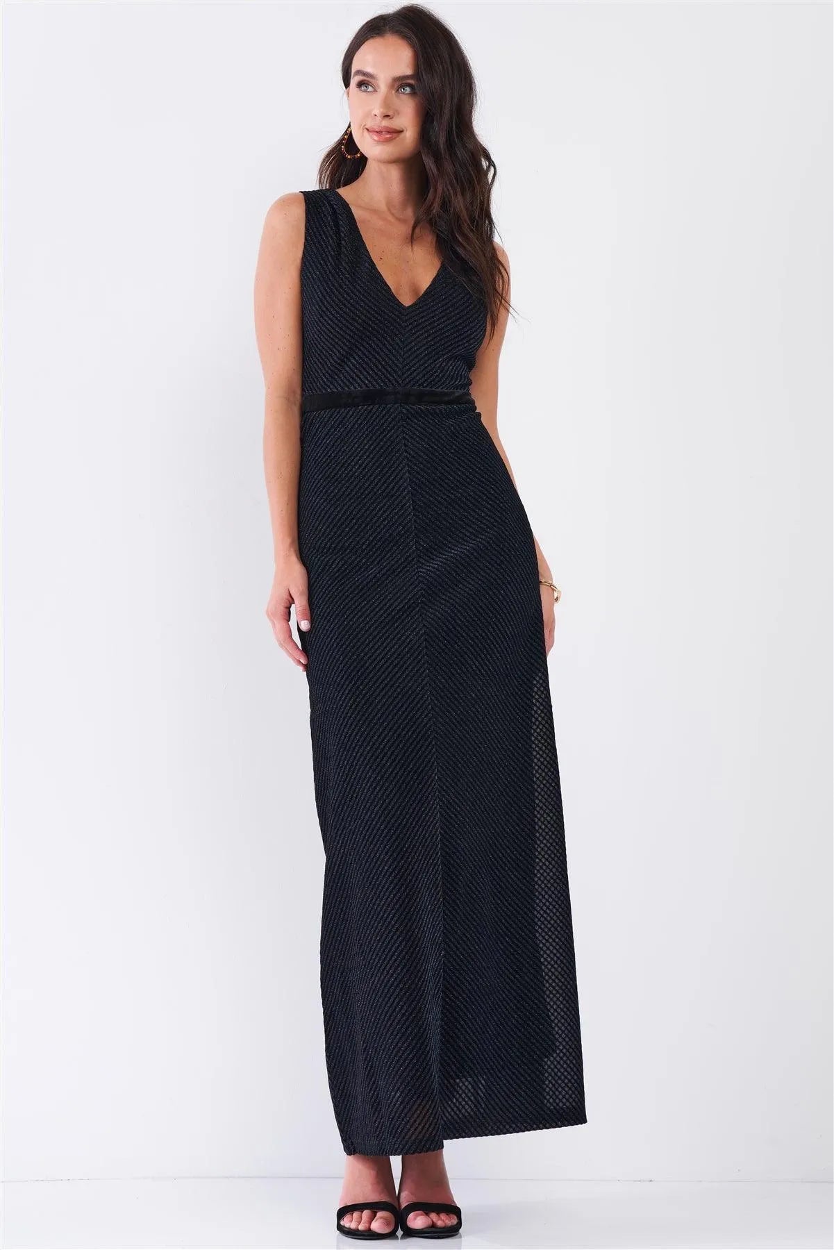 Navy Black Striped Sleeveless V-Neck Velvet Waistband Detail Fitted Maxi Dress /3-2-1