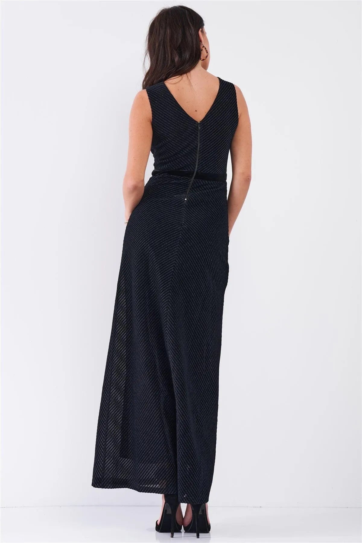 🖤Item features: Black & navy, glittery, striped, sleeveless, plunging front and back V-neck, pleated shoulder, black velvet waistband detail, back zipper closure, lined, stretchy, maxi length, chic, holiday look, stylish, sexy, fall/winter chic collection