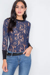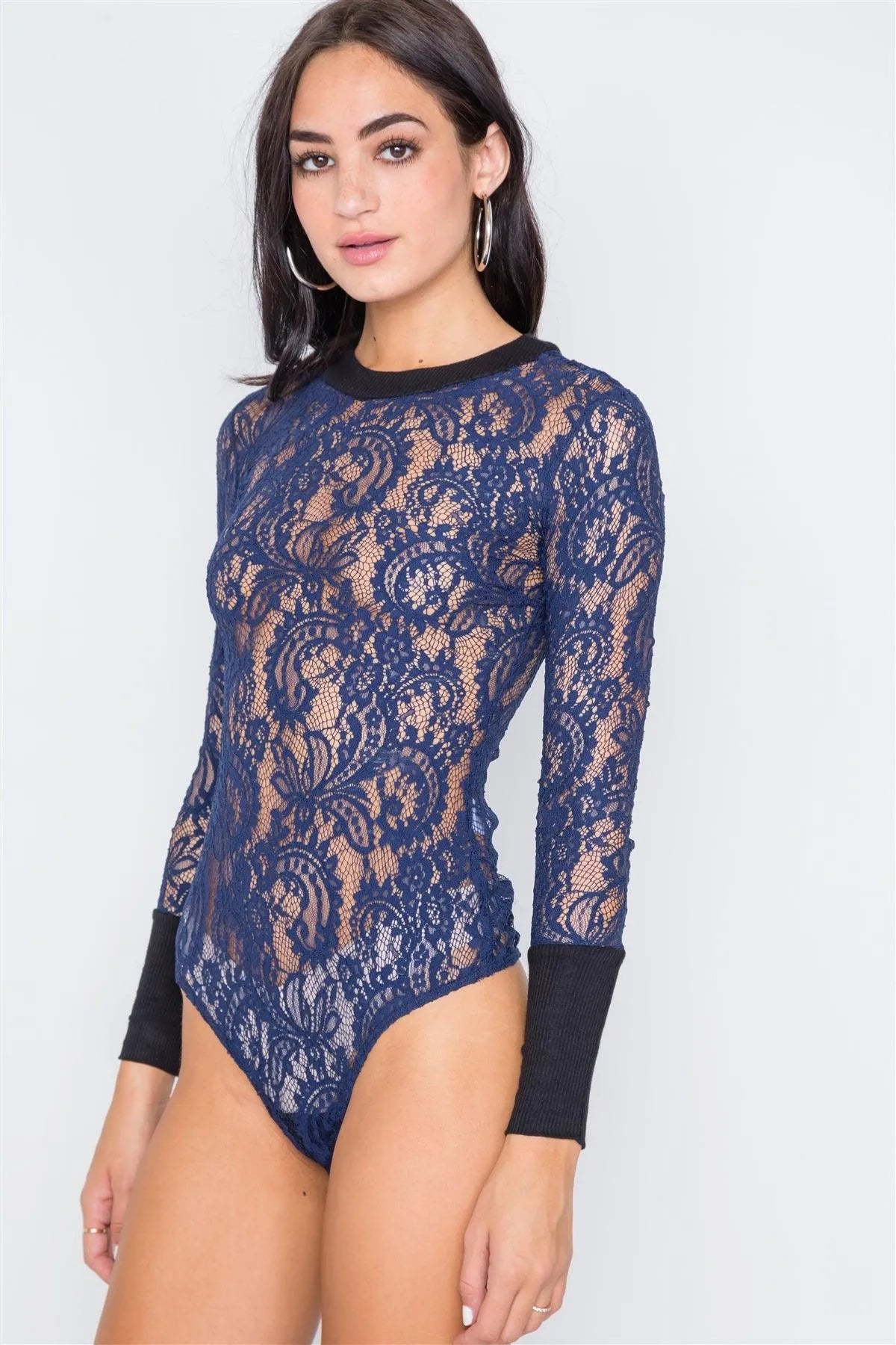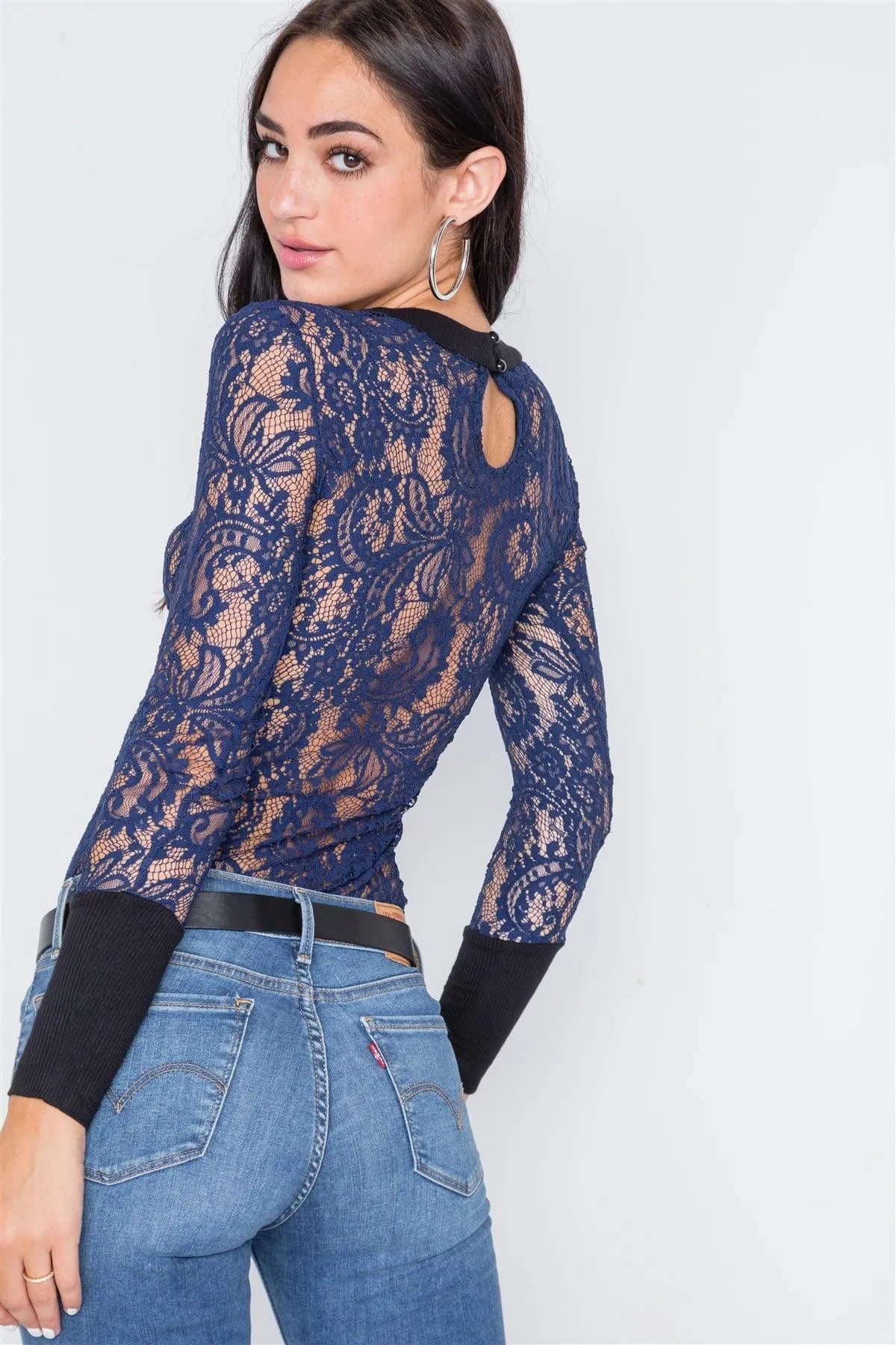Navy Blue Contrast Cuffs Sheer Lace Bodysuit /2-3-2-1