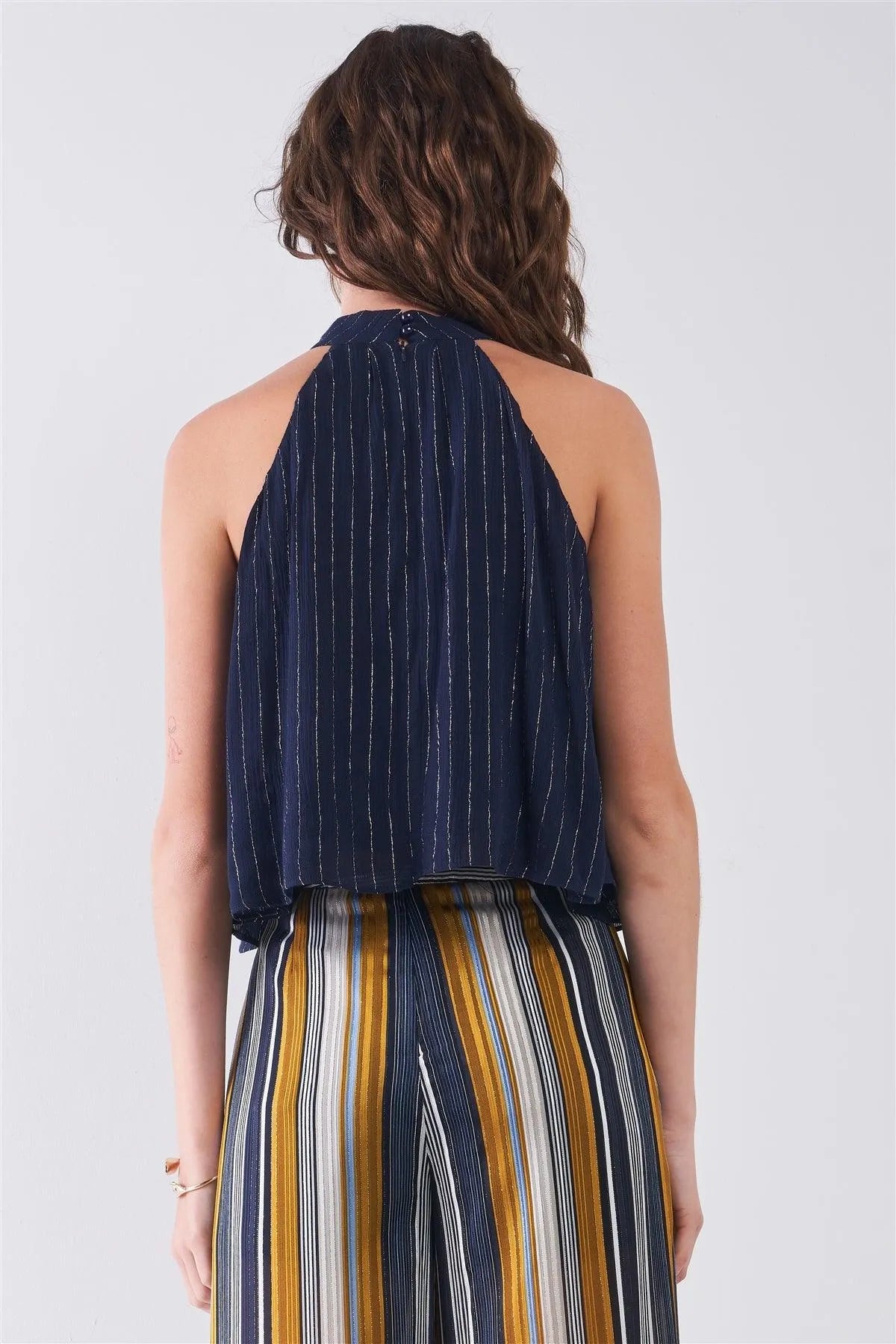Navy Blue & Silver Weave Striped Halter Neck Sleeveless Loose Fit Top /2-2