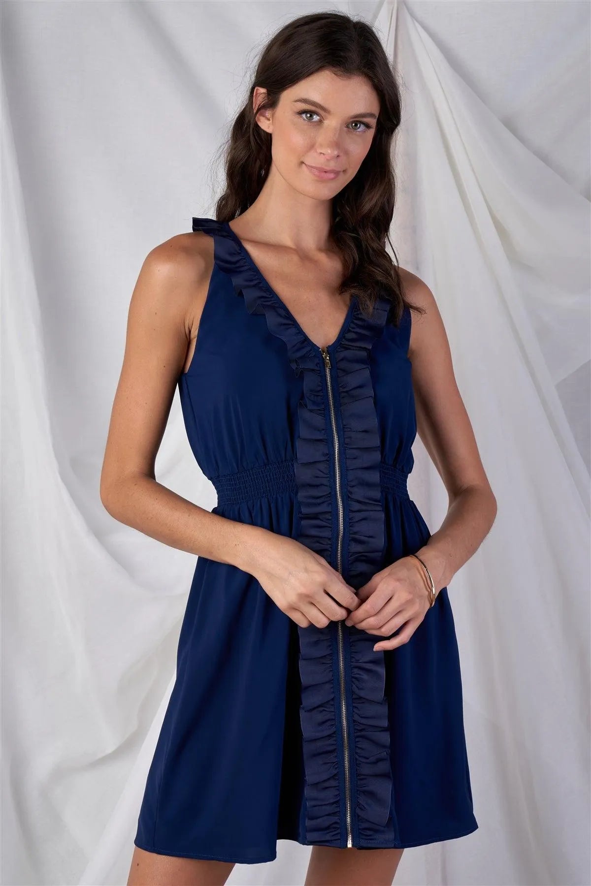 Navy Blue V-Neck Sleeveless Relaxed Fit Frill Front Zipper Hem Mini Dress /2-3-2