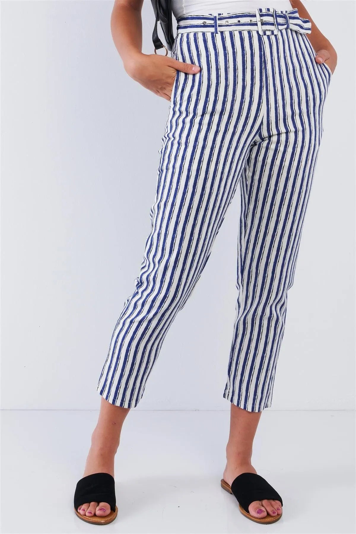 🖤 Item Features: Navy, white, black, striped, high waisted, tapered, capri, double lined, non-stretch, zipper back, square belt buckle, summer, resort, casual.