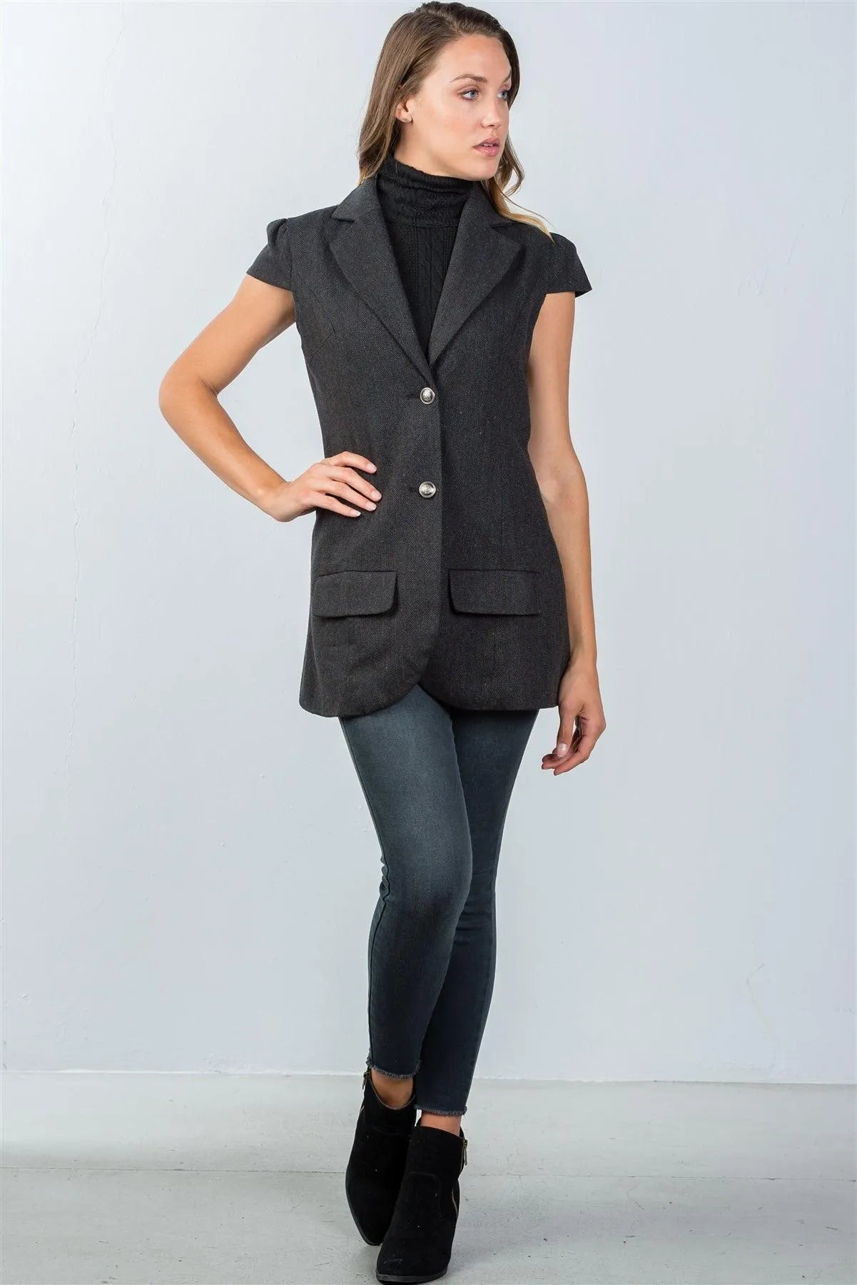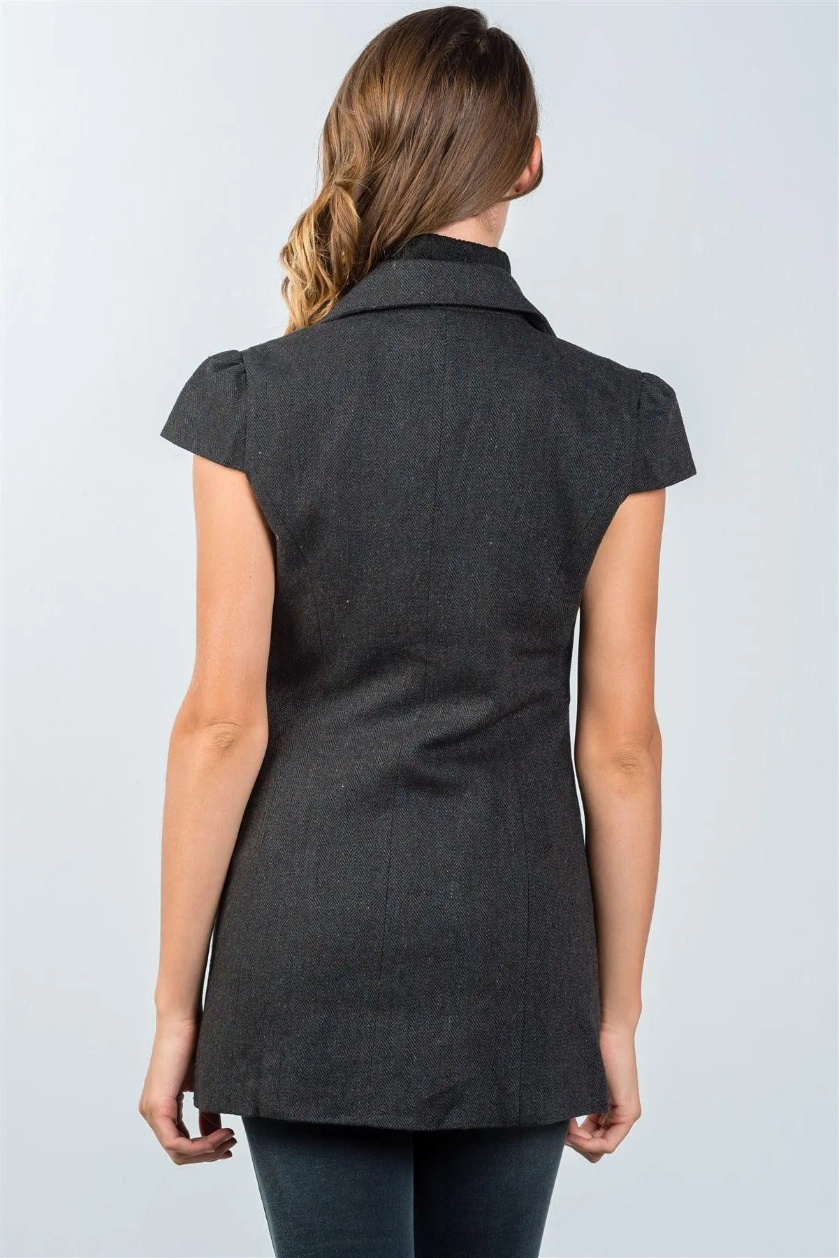 Jacket features: cap sleeves, front button closure, hits top of thigh, comfortable fit. Model is 5'8 wearing a size Small ( Waist: 25", Bust: 30A, Hips: 36")Item measurements: Length: 30", Bust: 35", Sleeve Length: 5"