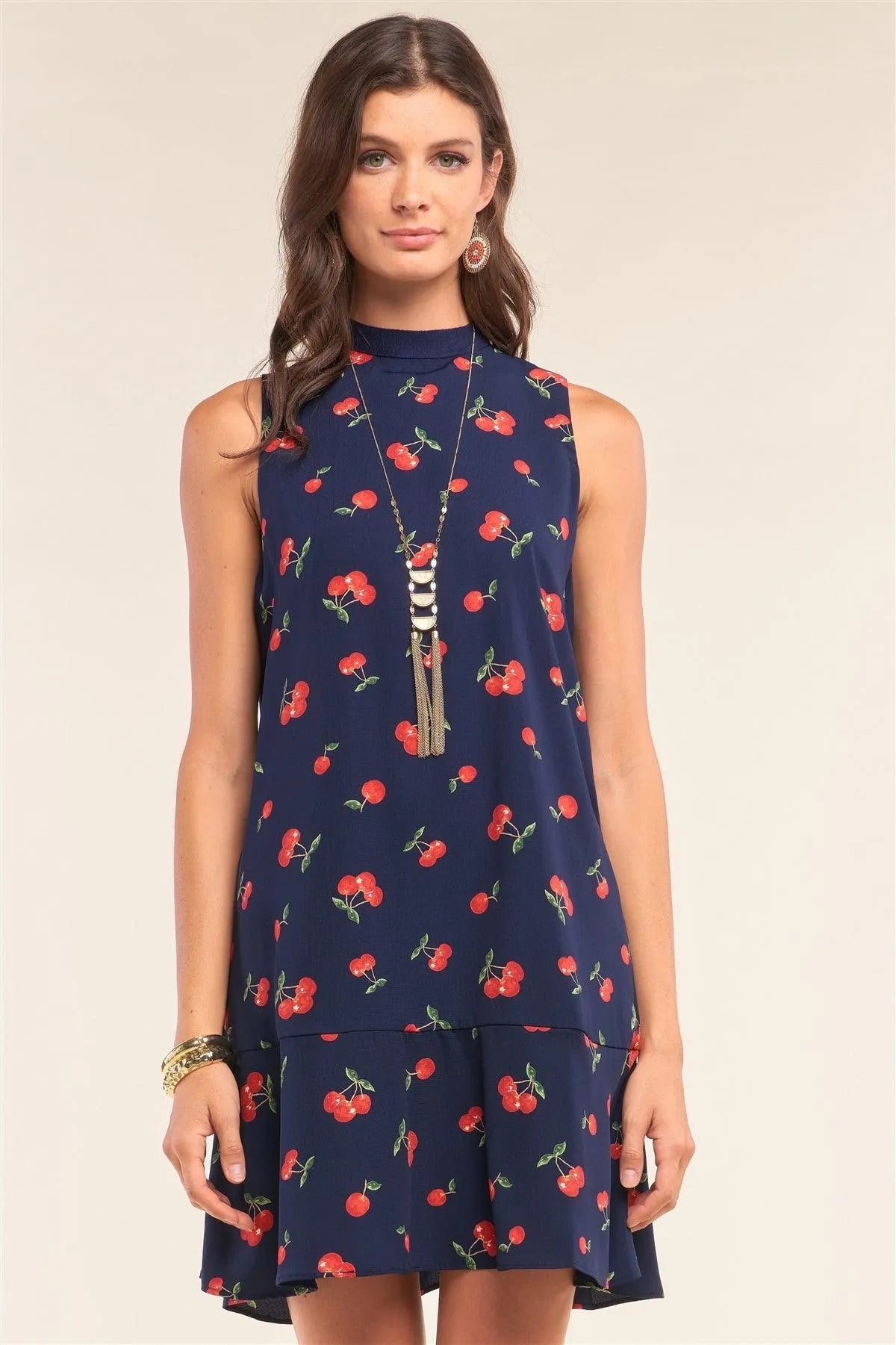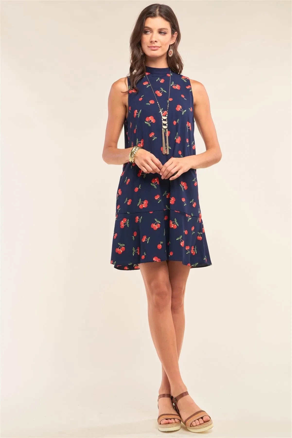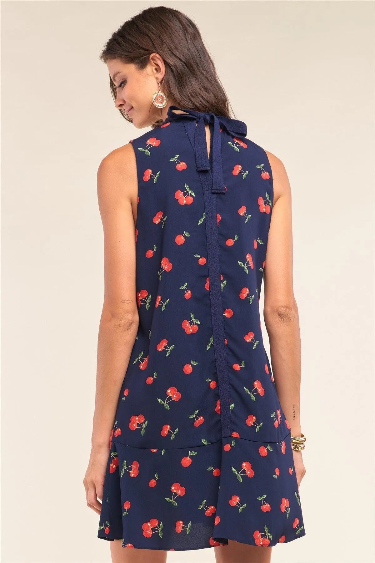 🖤 Item Features: Navy blue, multicolor cherry print, round neckline with knit self-tie detail from top down, sleeveless, relaxed fit, flare bottom hem, lined, non-stretch, mini length, casual, romantic, date look, sweet, girly, light, spring/summer collection