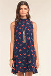 Very Cherry Day Navy Cherry Print Sleeveless Relaxed Fit Knit Self-Tie Neck Detail Flare Hem Mini Dress /1-2-2-1