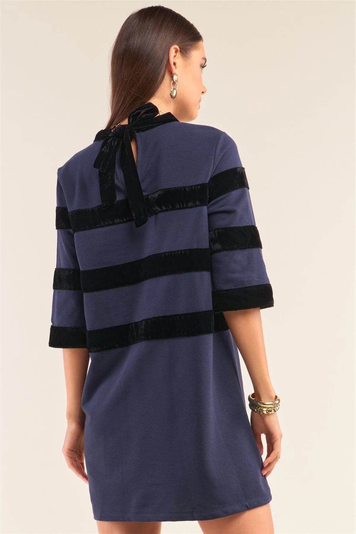 Navy Contrast Velvet Round Neck Open Back Self-Tie Keyhole 3/4 Sleeve Mini Dress /1-2-2-1