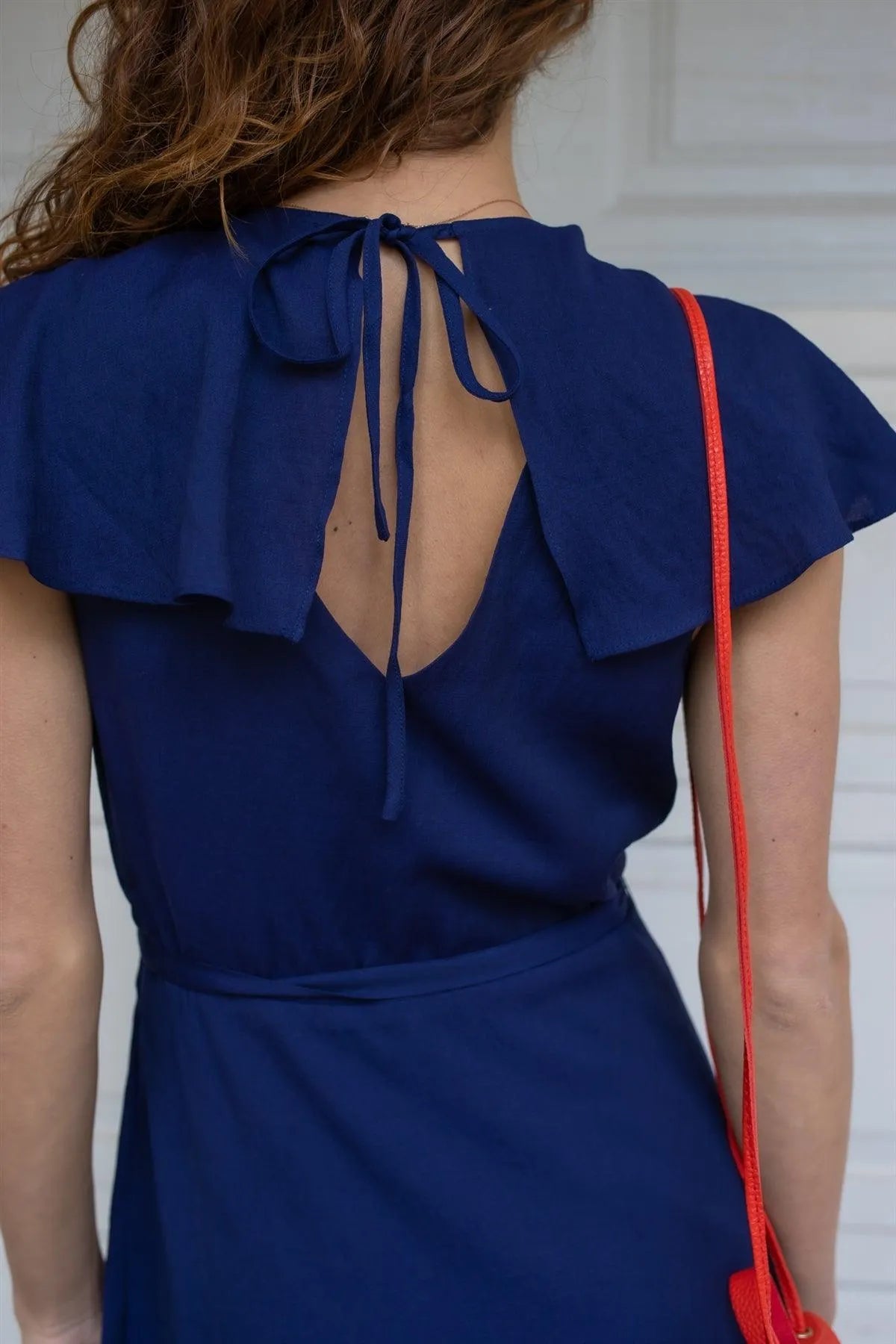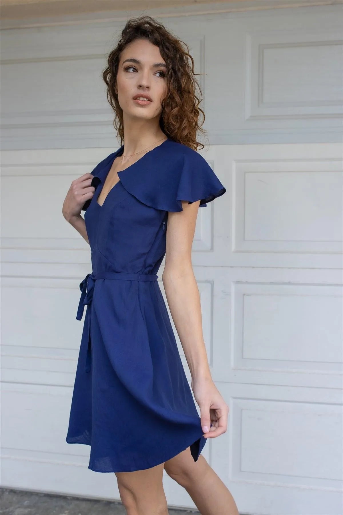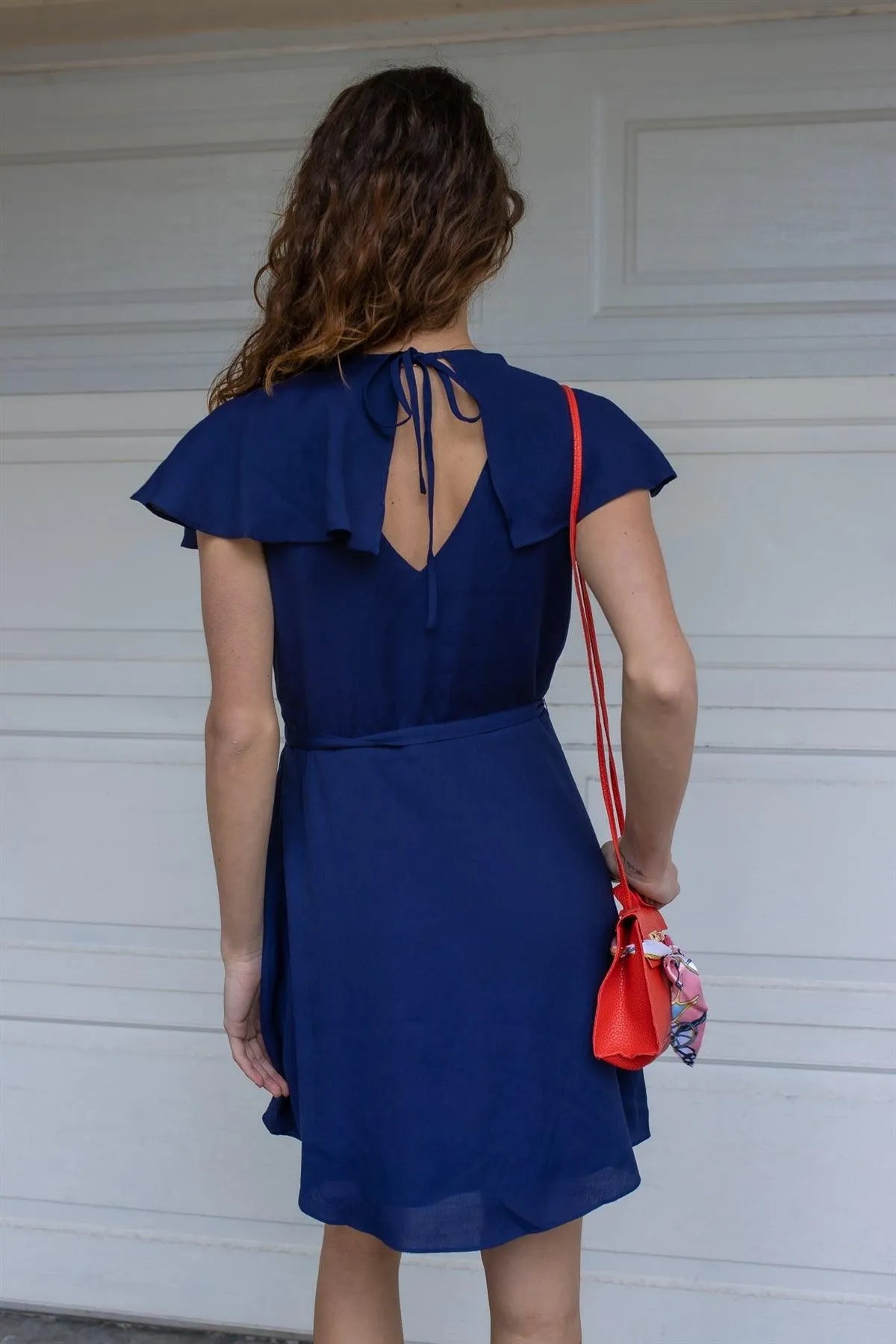 Navy Cotton Blend Flare Back Self-Tie Cape Belted Mini Dress /1-2-2-1