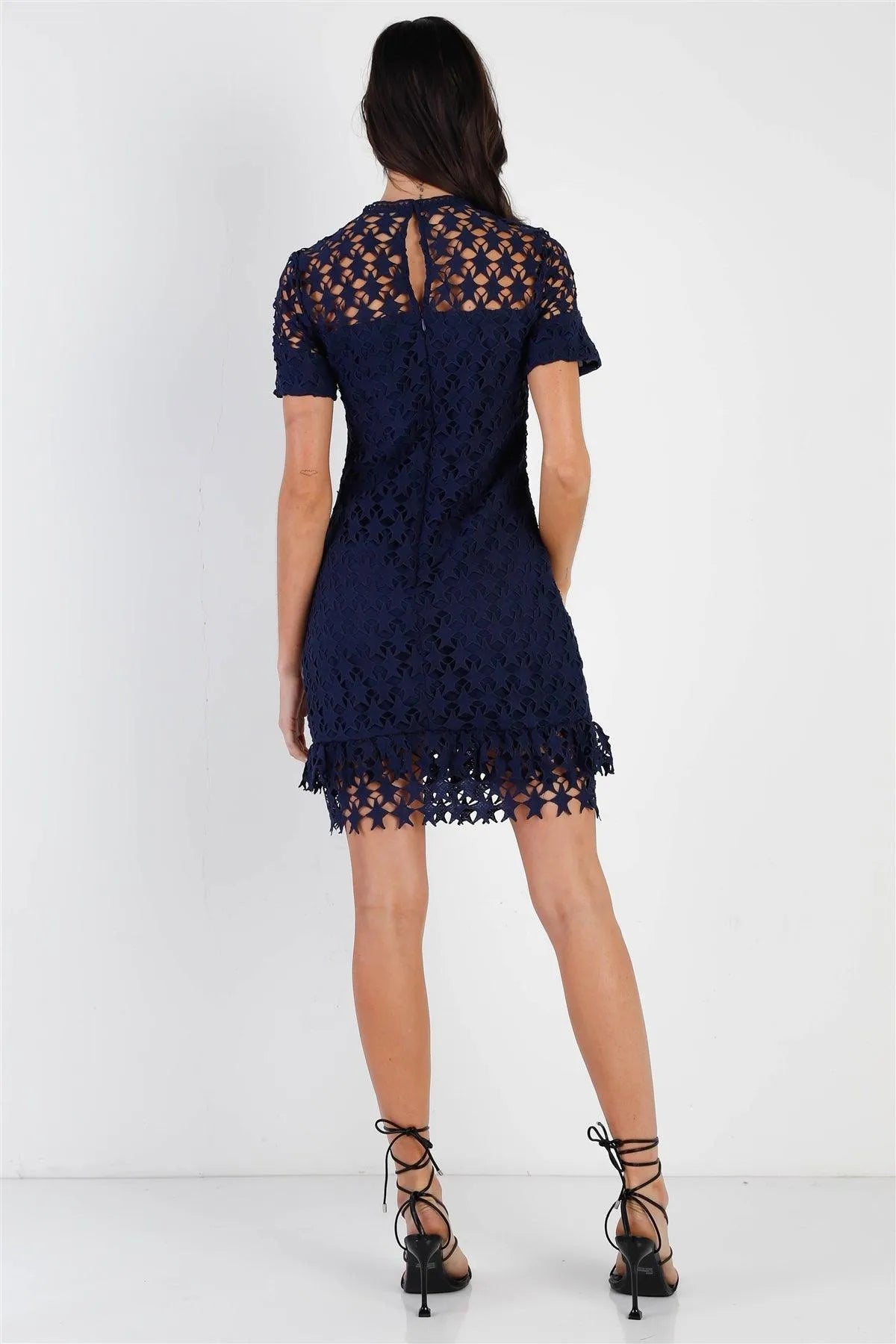 🖤 Item Features: Navy, solid color, embroidered, mock neckline, short sleeves, back hidden zipper with hook & eye and button loop closure, slim fit, mini length, lined, semi-sheer, non-stretchy, casual, elegant, cute, chic