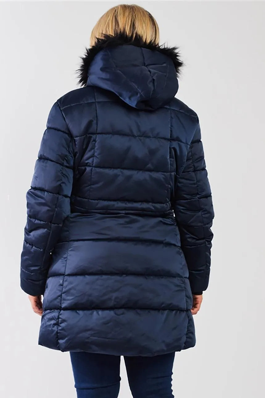 Navy Glossy Long Fitted Vegan Fur Hood Detail Winter Puffer Jacket /1-2-1-2