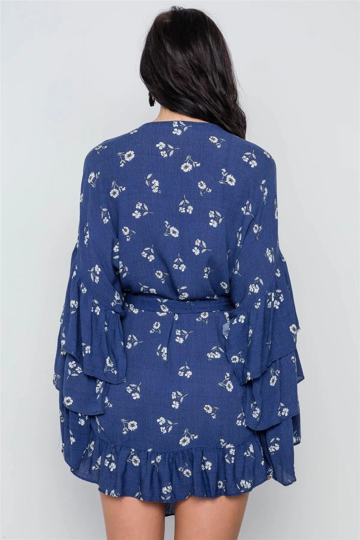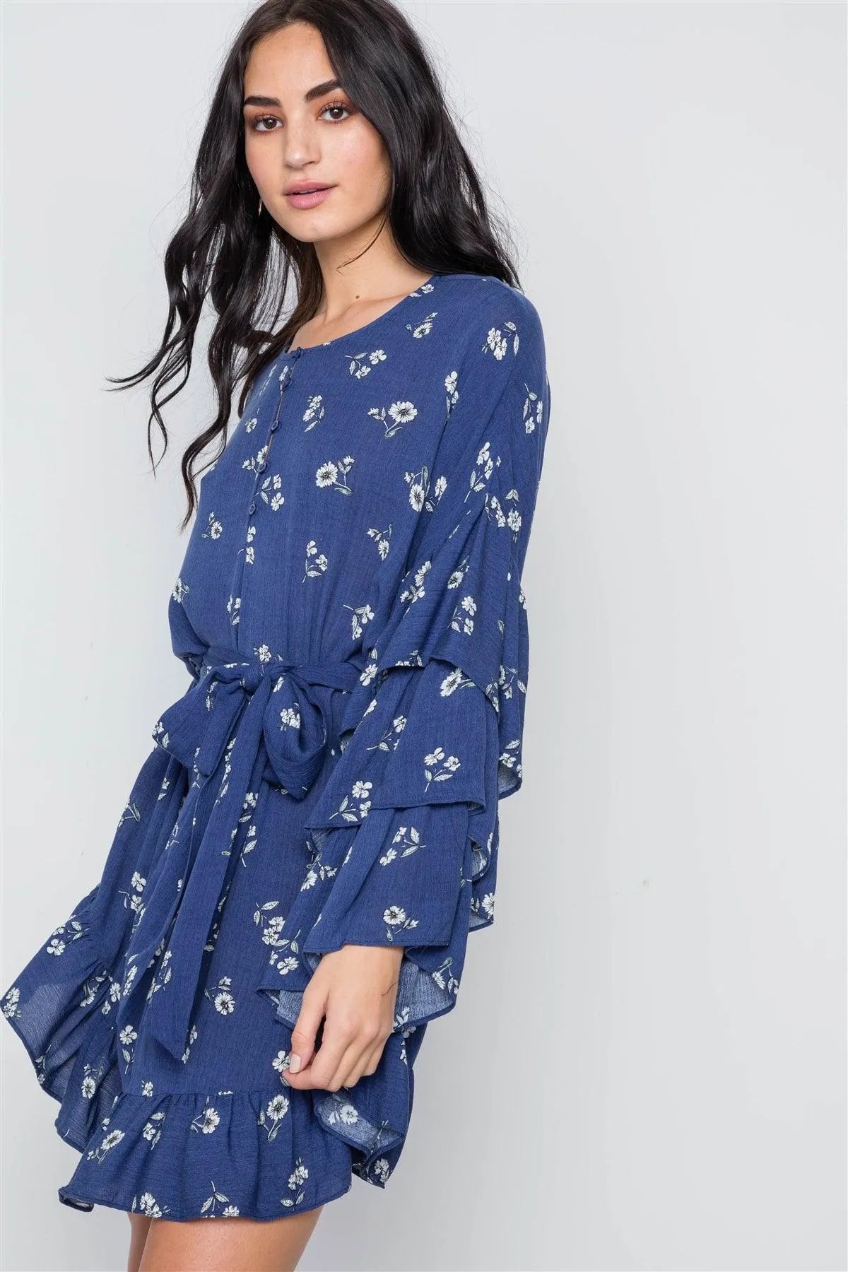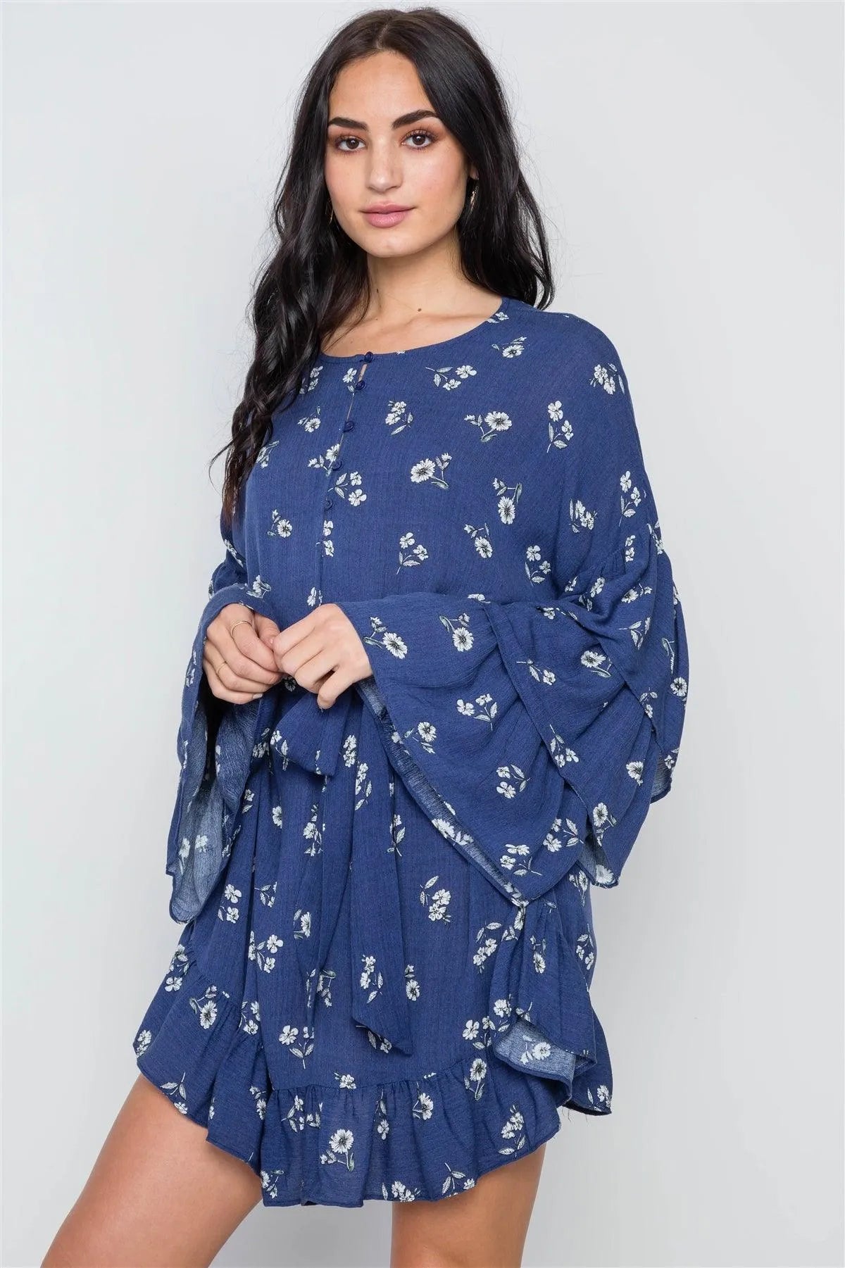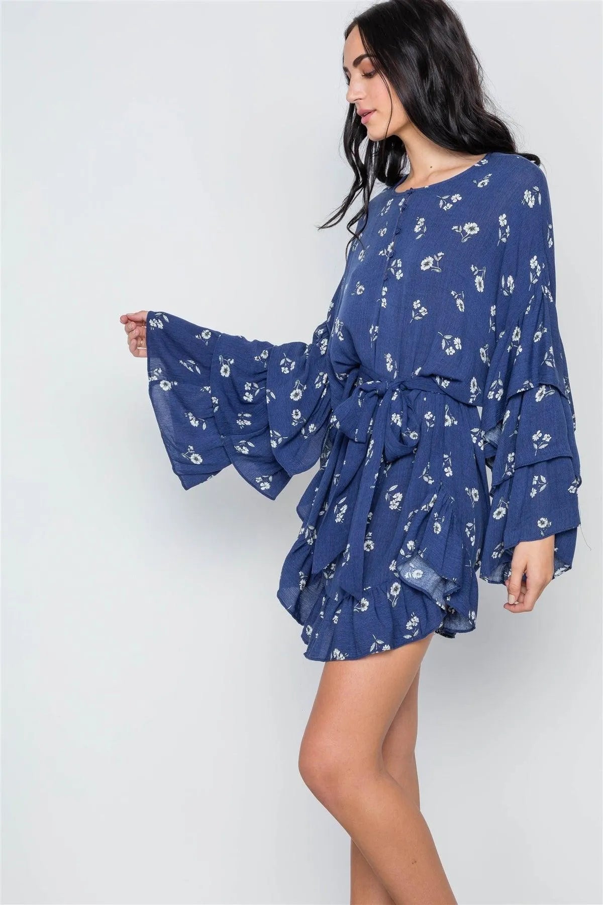 Navy Floral Print Long Bell Sleeves Dress /2-2-1