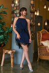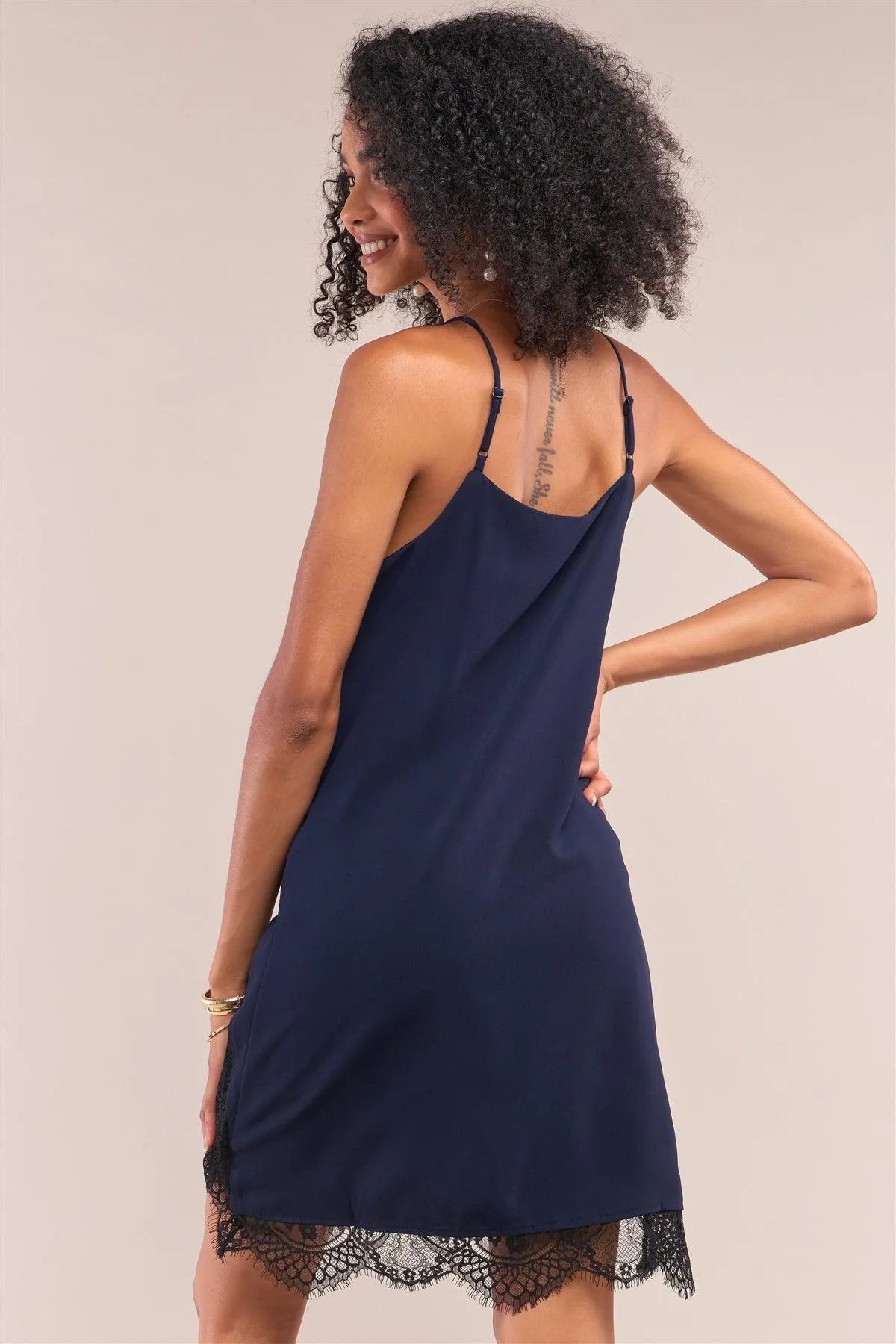 Navy Halter Neck Sleeveless Front Self-Tie Lace Trim Slip Mini Dress /1-3-2