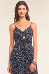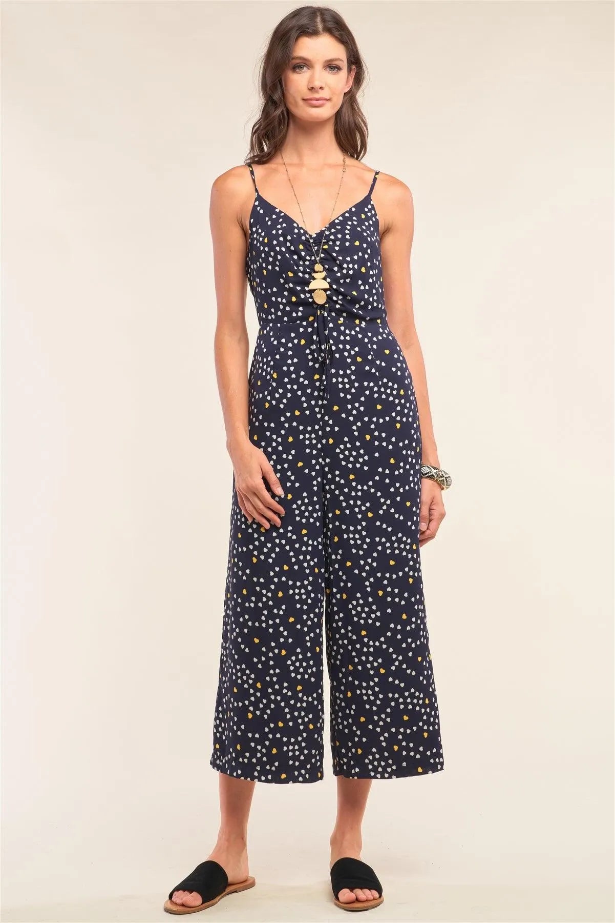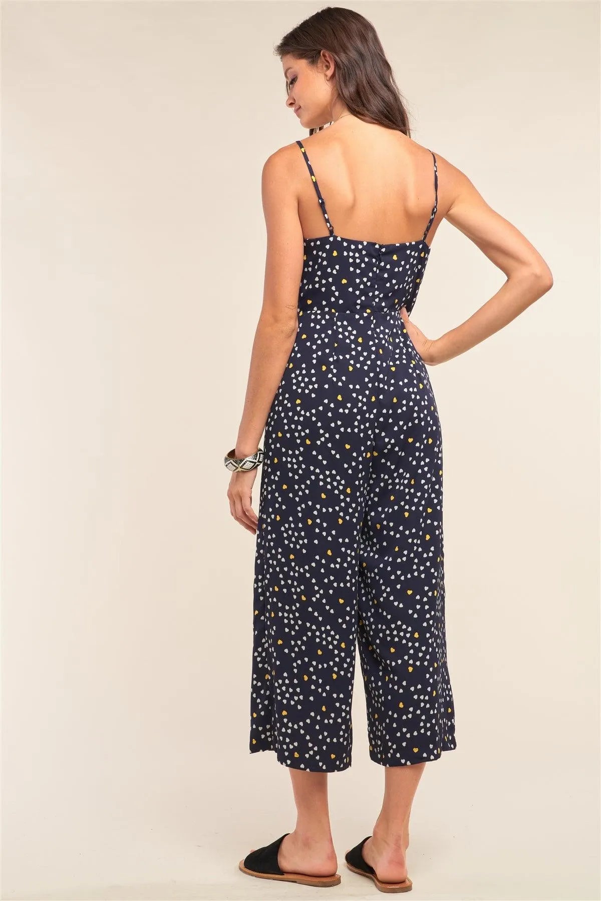 🖤 Item Features: Navy, white and yellow heart print allover, sleeveless, adjustable shoulder straps, fitted waistline, gathered chest draw string tie detail, V-neckline, wide leg, capri length, lined, non-stretch, casual, cute, date look, comfy, vacation vibe, summertime, spring/summer collection