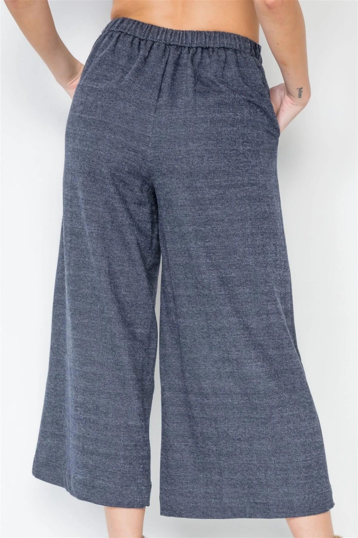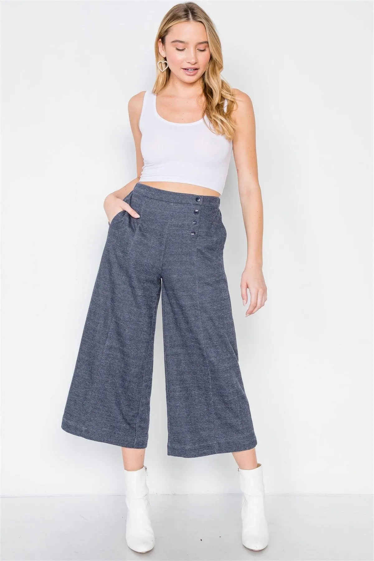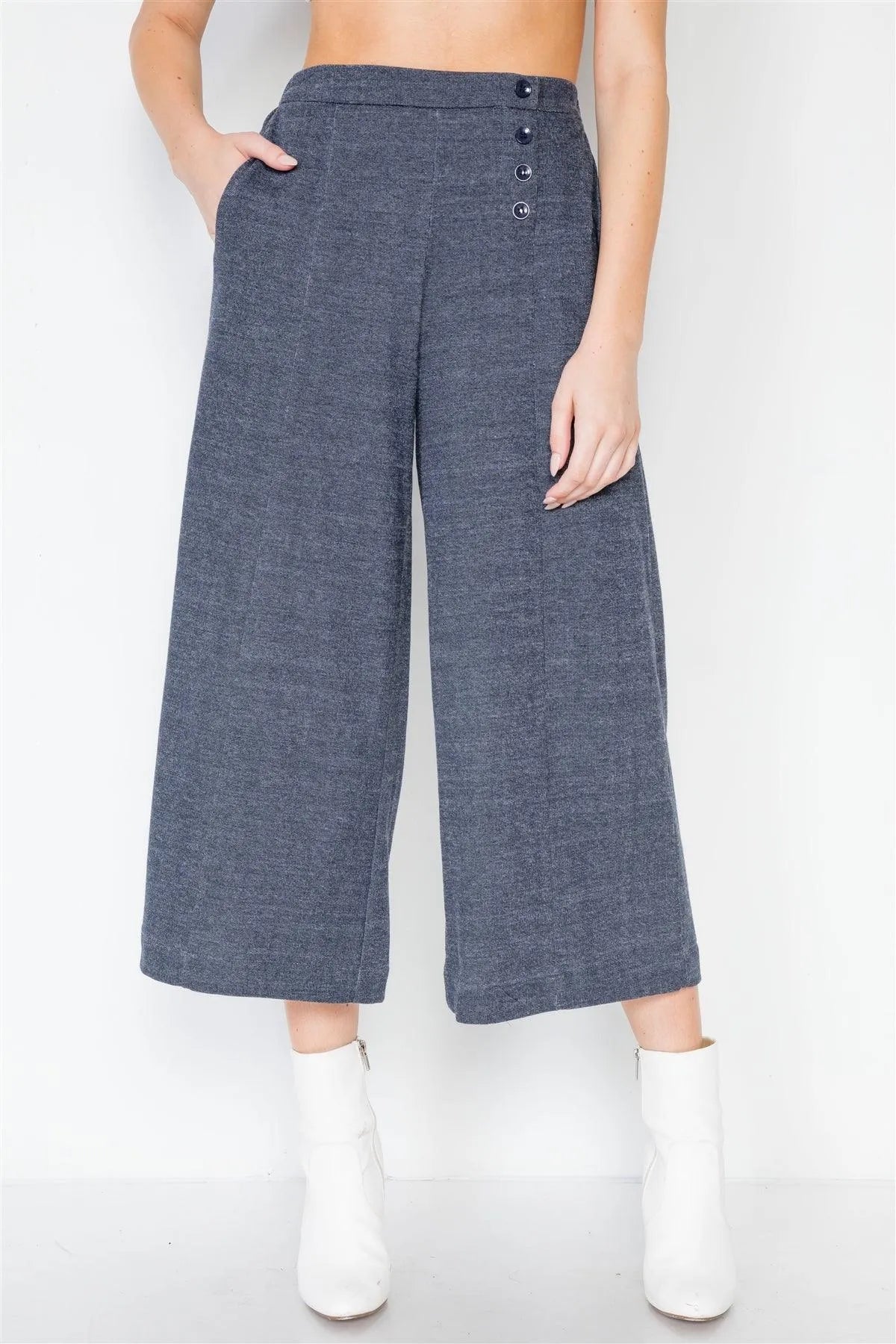 Navy Knit Side Button Wide Leg Ankle Pants /2-2-2