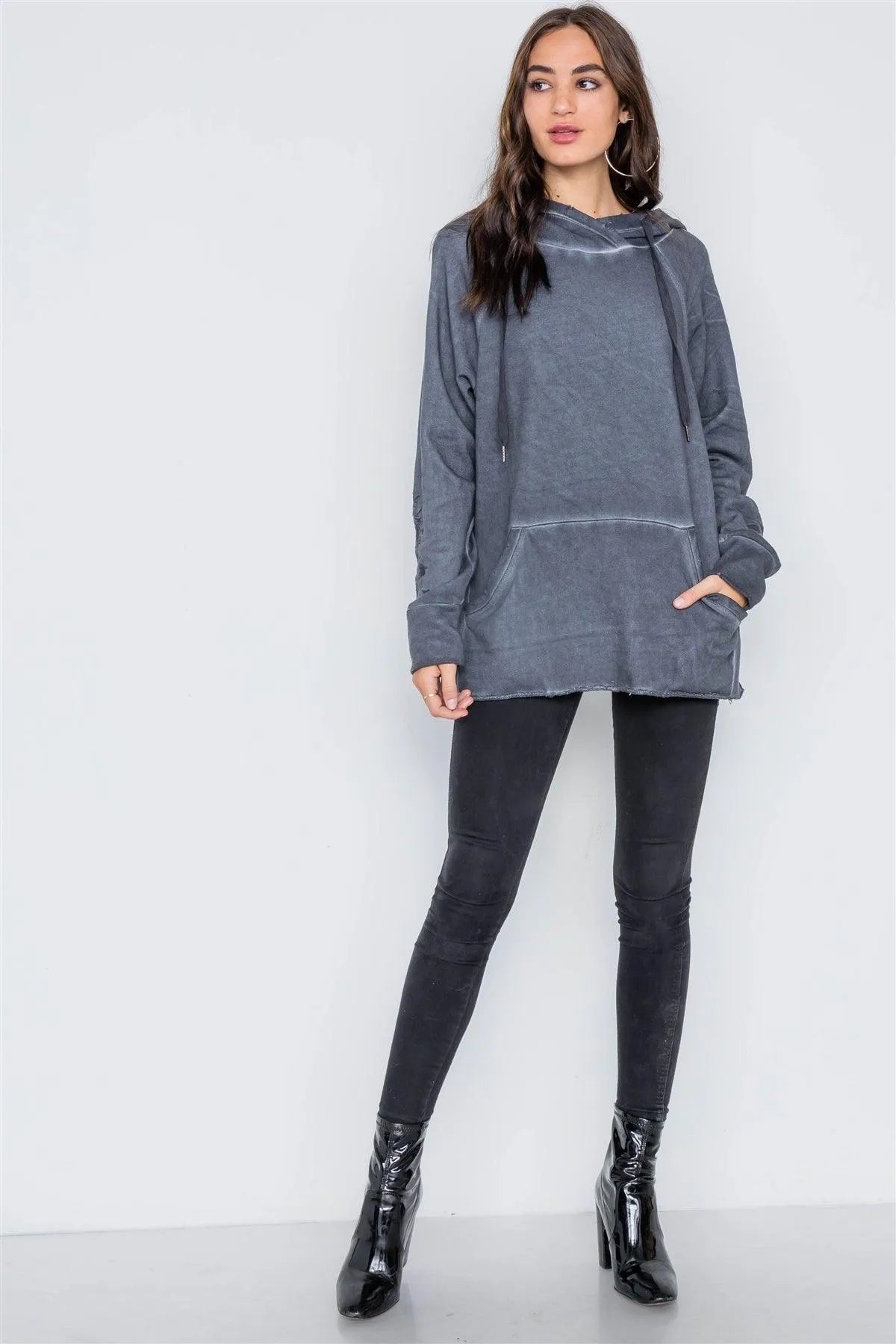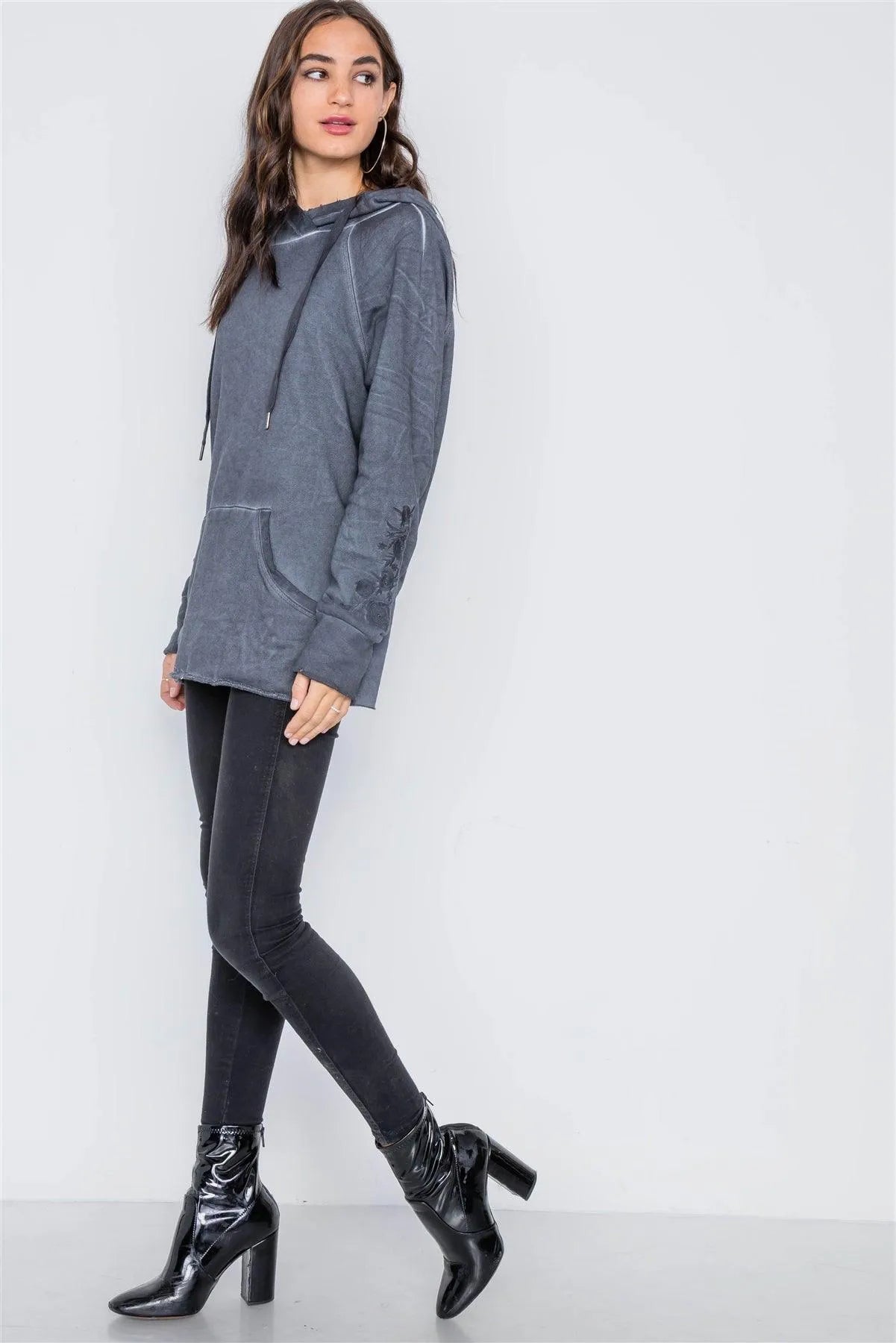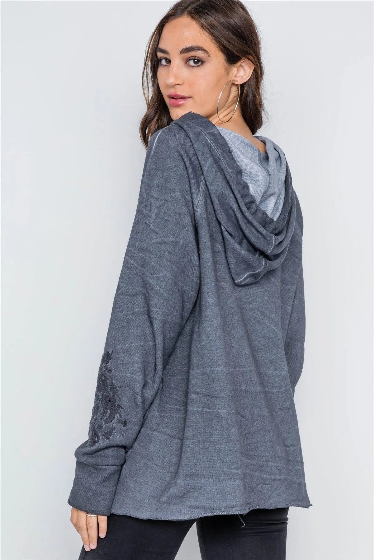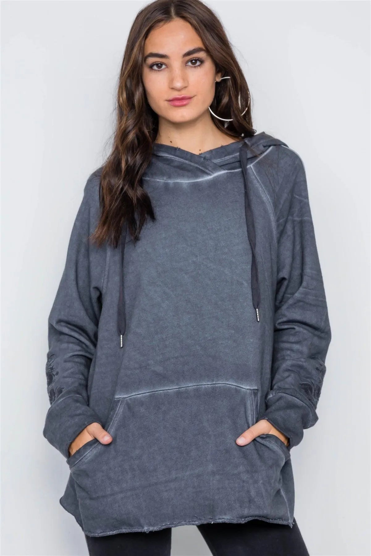 Sweater features: long sleeves, drawstring hood with distressed detailing, dropped shoulders, kangaroo pocket, raw hen, floral embroidery at sleevesModel is 5'9 wearing a size Small (Waist: 24", Bust: 32A, Hips: 34")Size Small Item Measurements: Length: 28", Bust: 44" Sleeves: 28.5"True to size