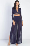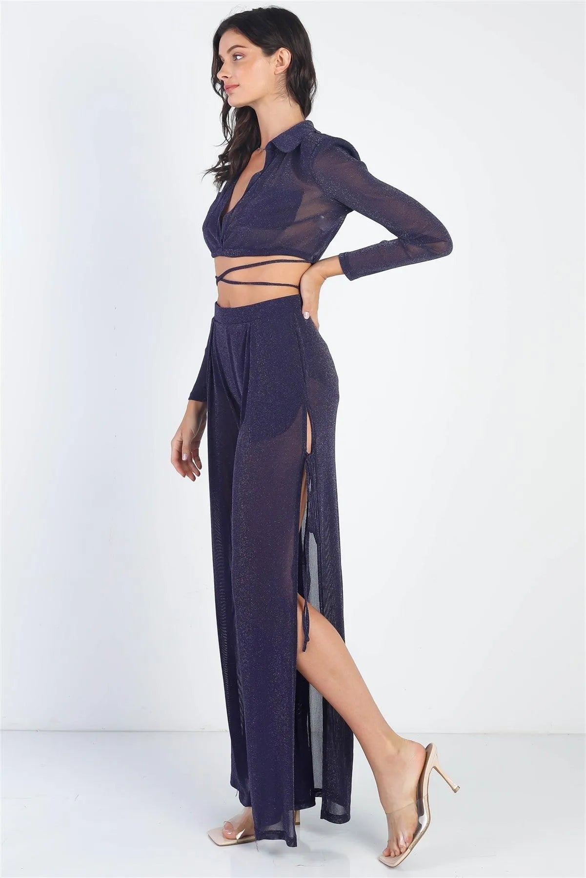 🖤 Item Features: Navy, lurex, shoulder pads, long sleeves, collared, two front pockets, v-neckline, adjustable drawstring wrap around hem, cropped top, high waist pants, elasticized waistband, back zipper closure, side slits with self-tie details, wide leg, sheer, unlined, semi-stretchy, hot, sexy, eye-catching, shiny, night-out attire