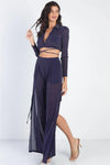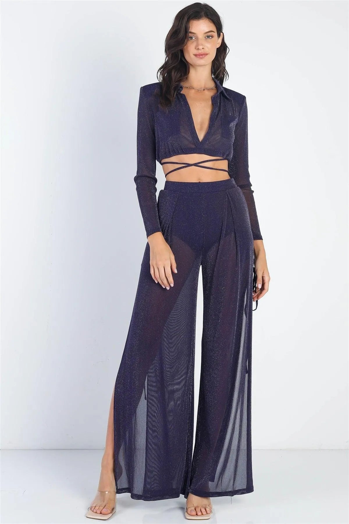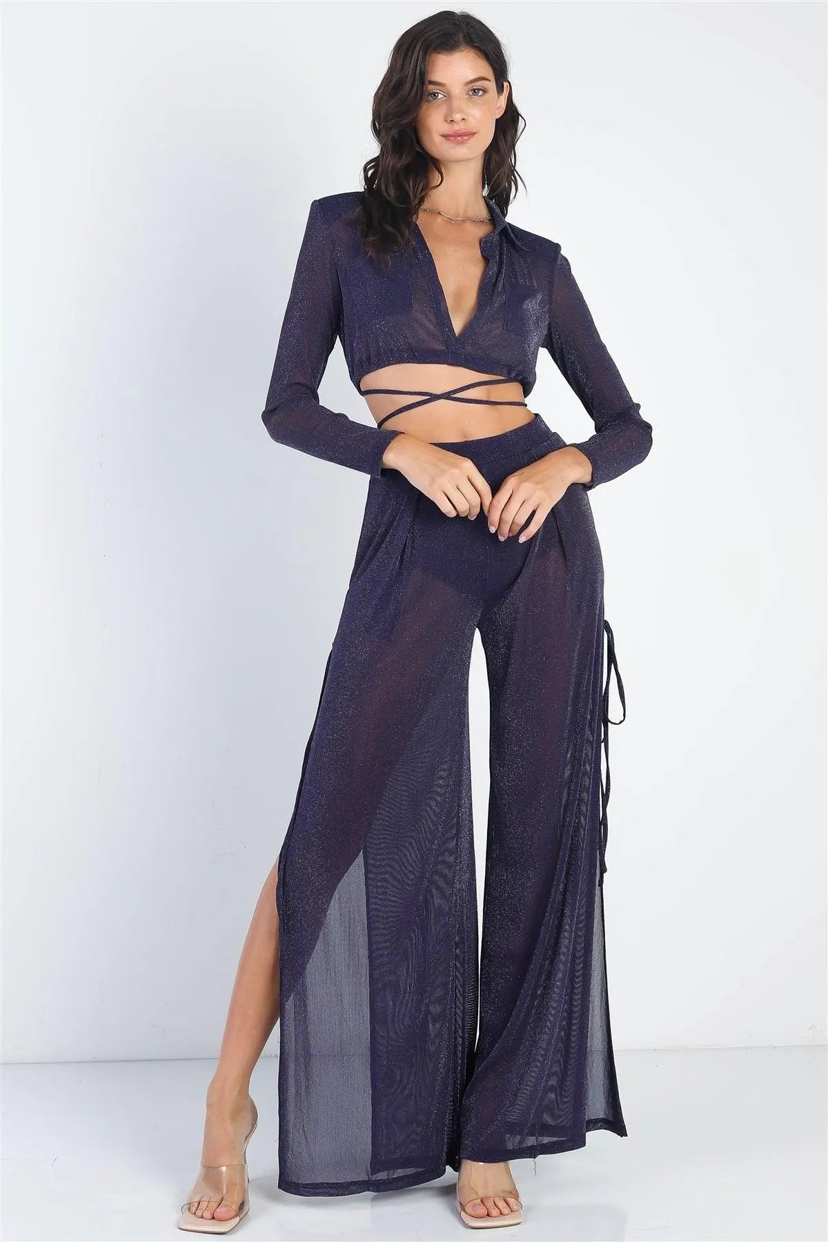 🖤 Item Features: Navy, lurex, shoulder pads, long sleeves, collared, two front pockets, v-neckline, adjustable drawstring wrap around hem, cropped top, high waist pants, elasticized waistband, back zipper closure, side slits with self-tie details, wide leg, sheer, unlined, semi-stretchy, hot, sexy, eye-catching, shiny, night-out attire