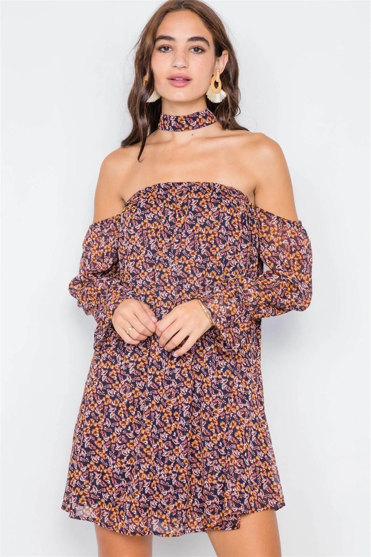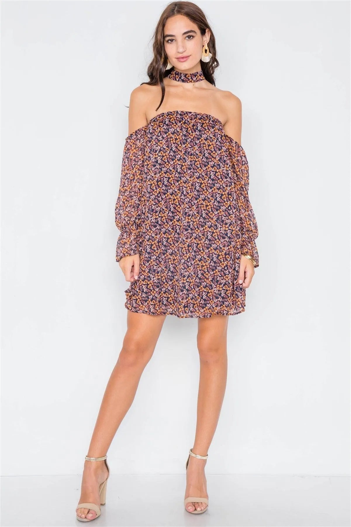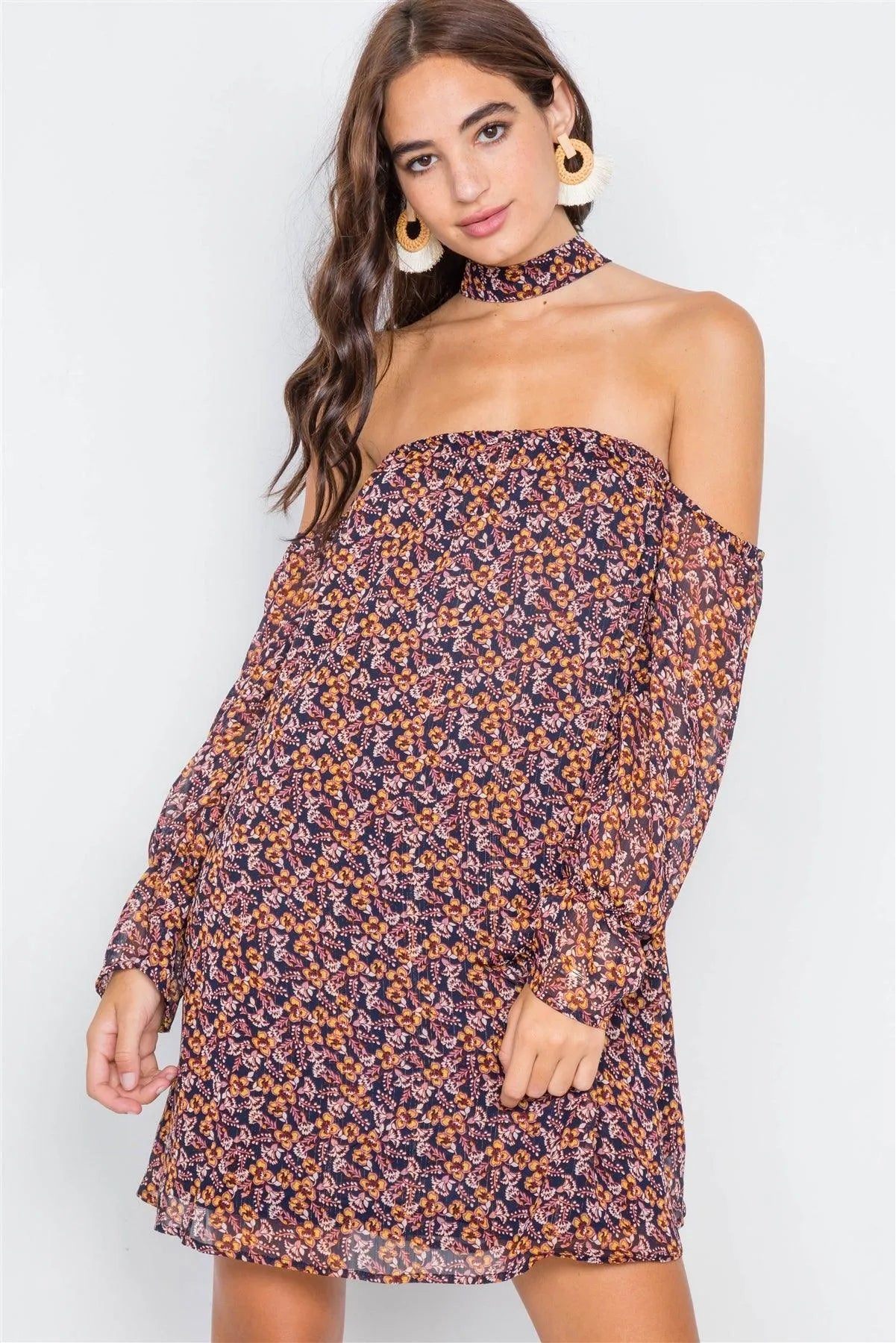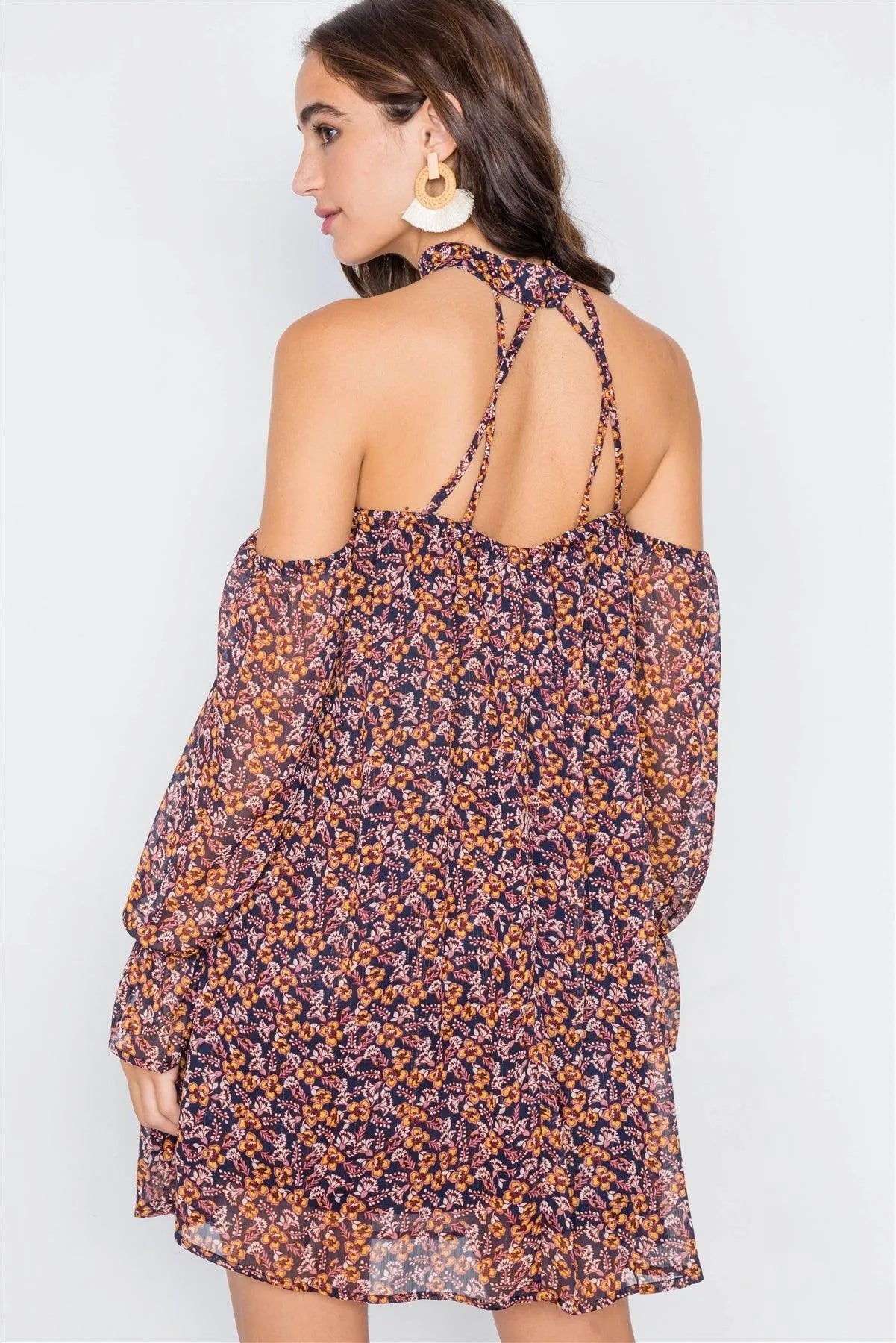 Dress features: cut-out halter neck, back neck button closure, floral print, off-the-shoulder, elastic shoulder, elastic flounce cuff, lined, sheer material. Top Measurements: Length: 37.5", Bust: 32" , Sleeves 18"Model is 5'10 and wearing Small (Waist: ", Bust: , Hips: ")True to size