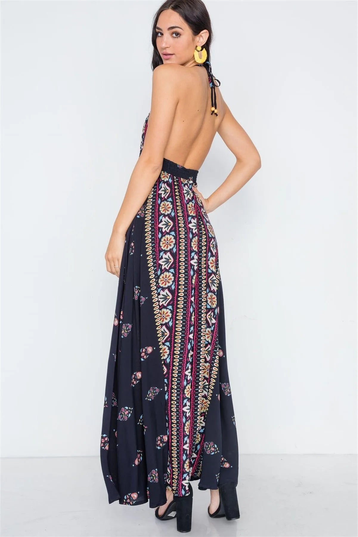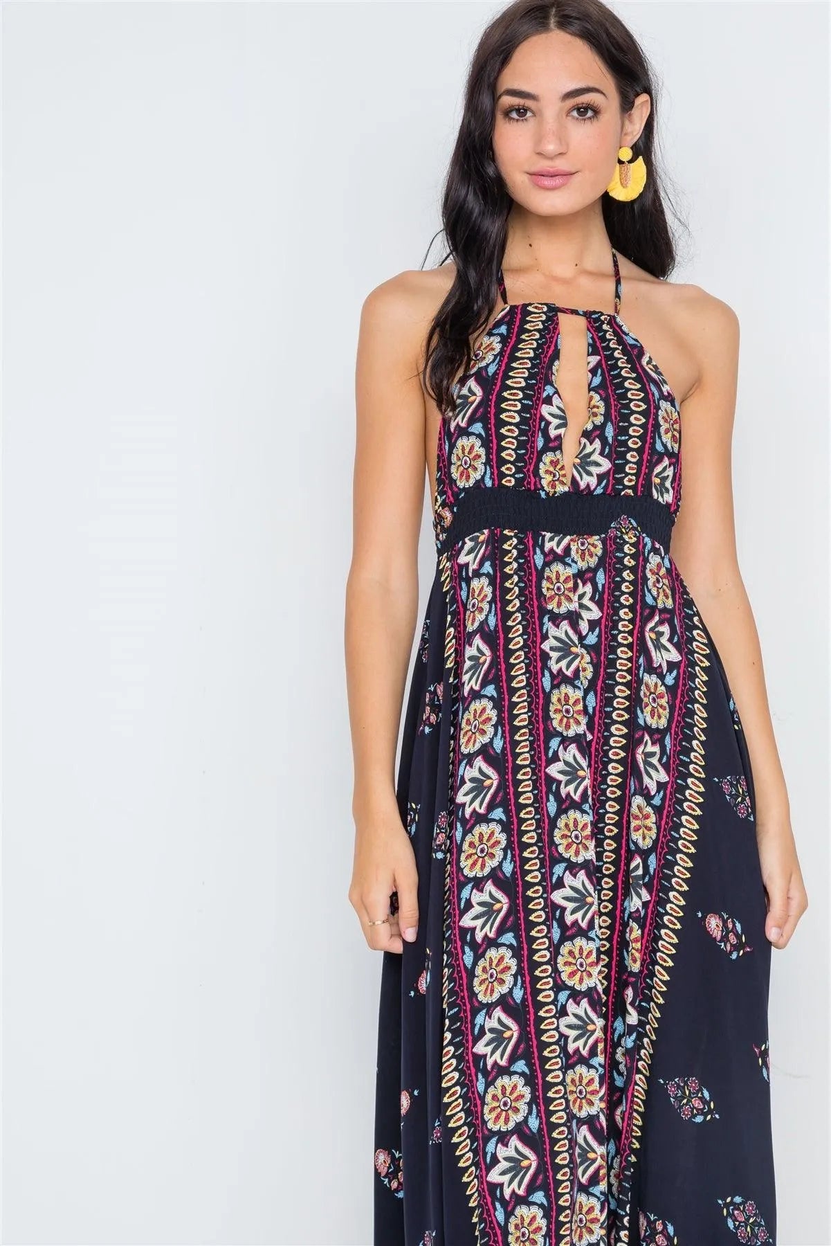 Navy Mustard Halter Neck Multi Print Maxi Dress /3-1-1