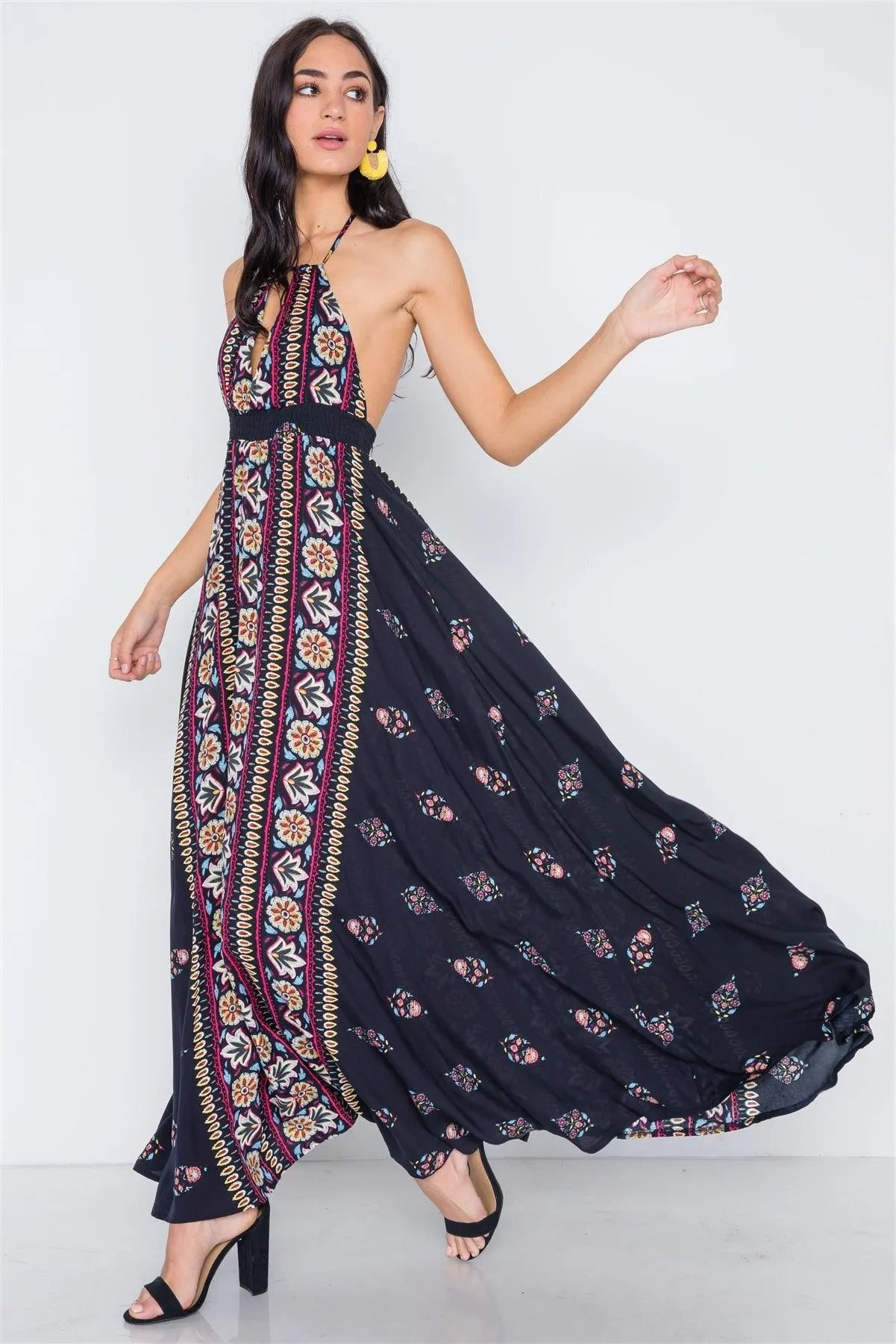 Navy Mustard Halter Neck Multi Print Maxi Dress /1-3-2-1