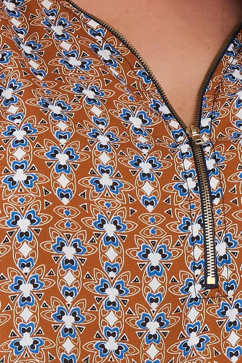 Top features: all over multi print, 3/4 sleeve, front detailed zipper, Model is 5'6 and wearing a 1X ( Bust: 38DD", Waist: 39", Hips: 50")Item Measurements: Length: 37", Bust: 40"Item comes pre-packed with hang tagsTrue to size