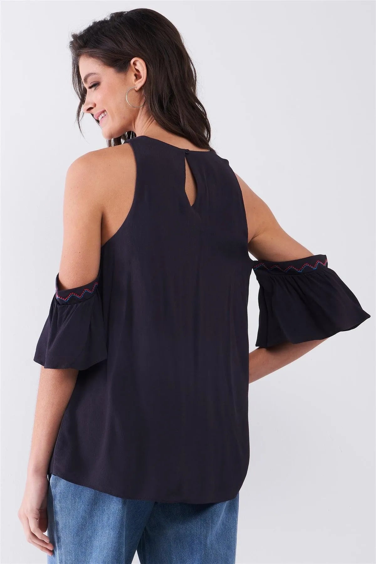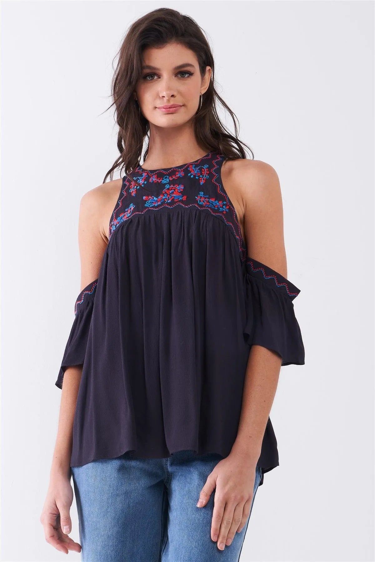 🖤Item Features: Dark navy, multicolor embroidered trim detail, round neckline with back loop button closure, off-the-shoulder angel mini sleeve, babydoll cut, unlined, non-stretch, boho, casual, light, breathable, comfy, spring/summer collection