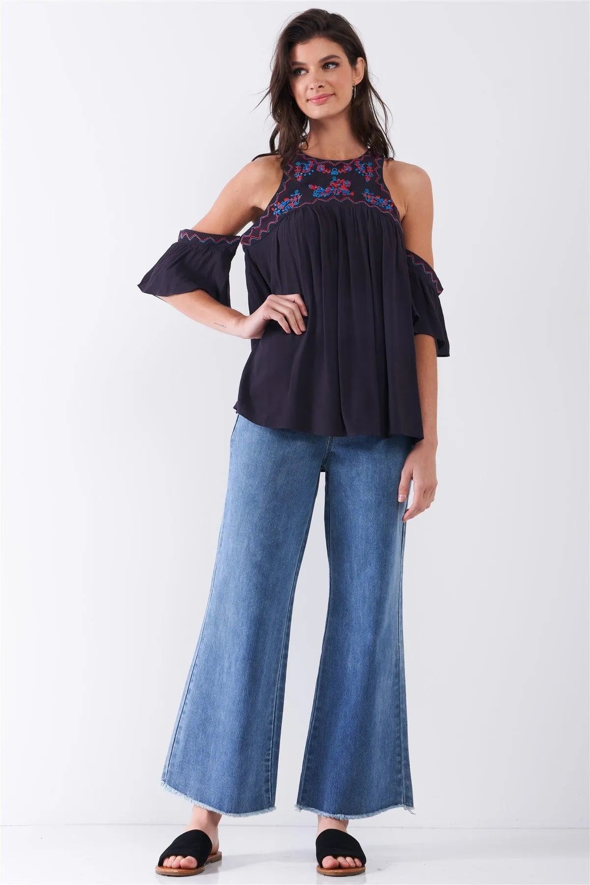 Dark Navy Off-The-Shoulder Angel Mini Sleeve Embroidered Trim Detail Babydoll Top /1-2-2-1