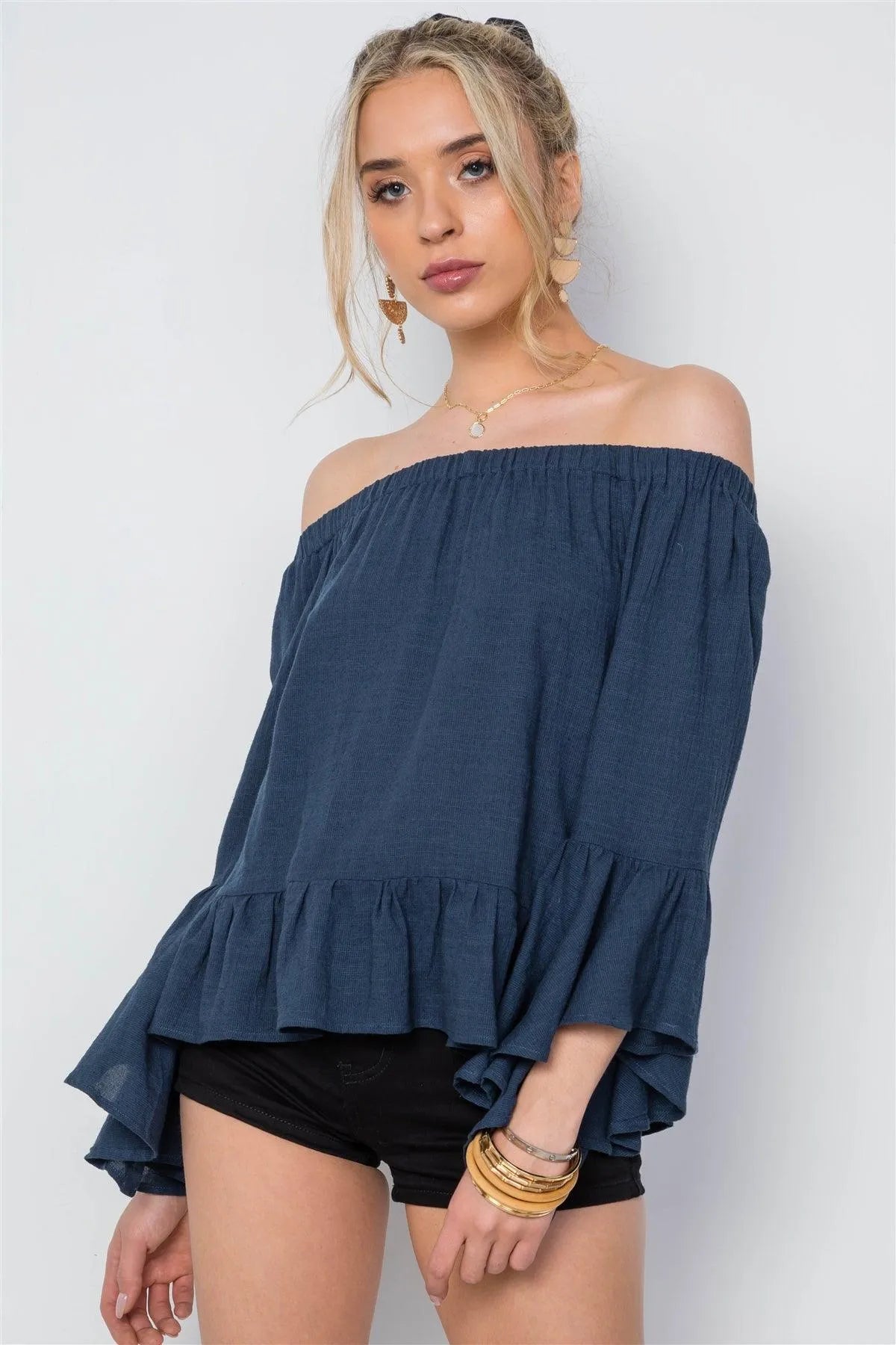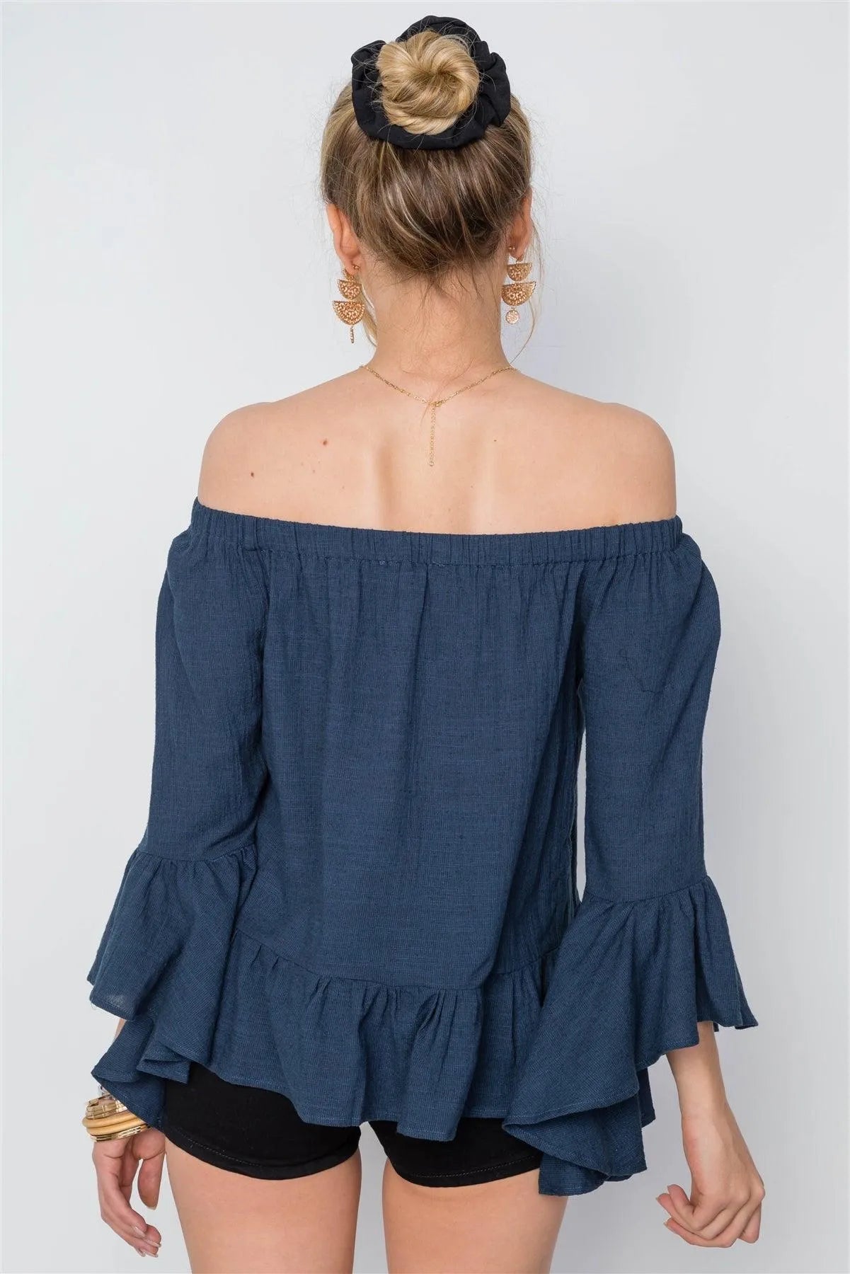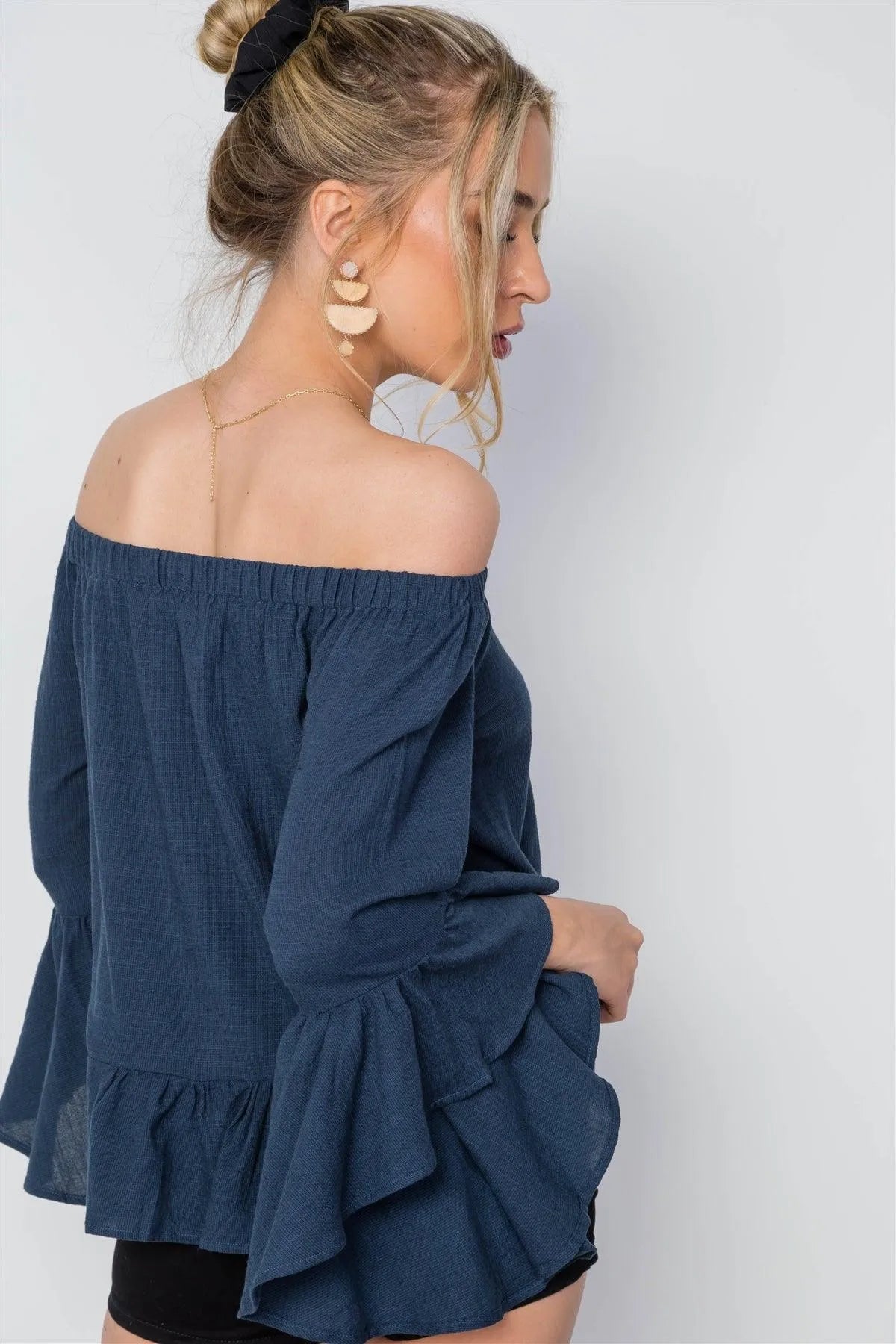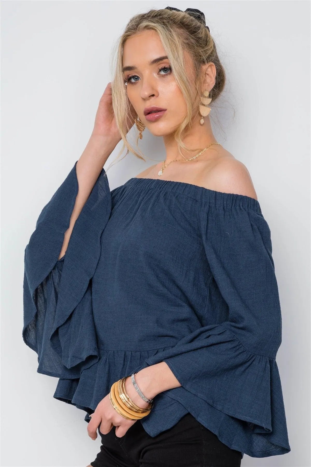 Navy Off-The-Shoulder Bell Sleeves Flounce Top /1-2-2-1