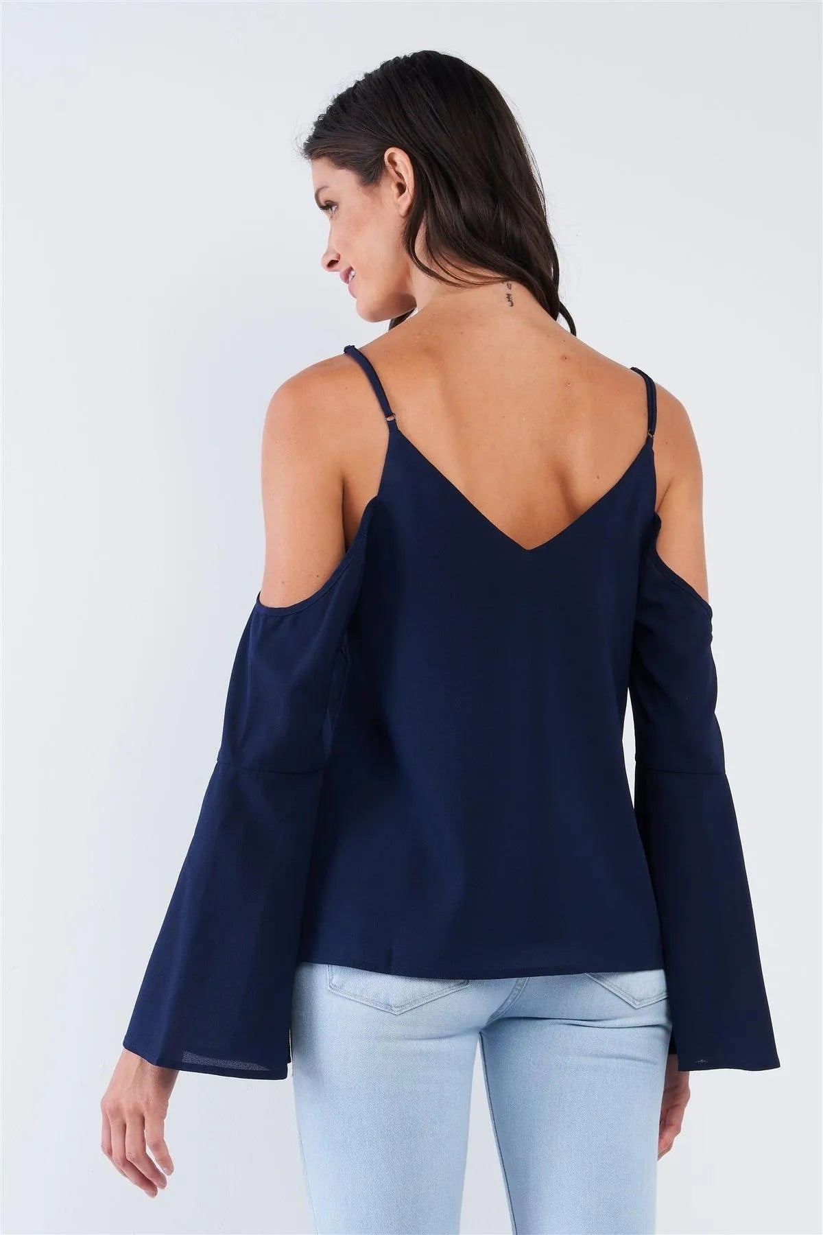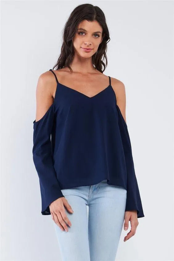 Navy Blue Relaxed Fit V-Neck Off-The-Shoulder Long Trumpet Sleeve Top