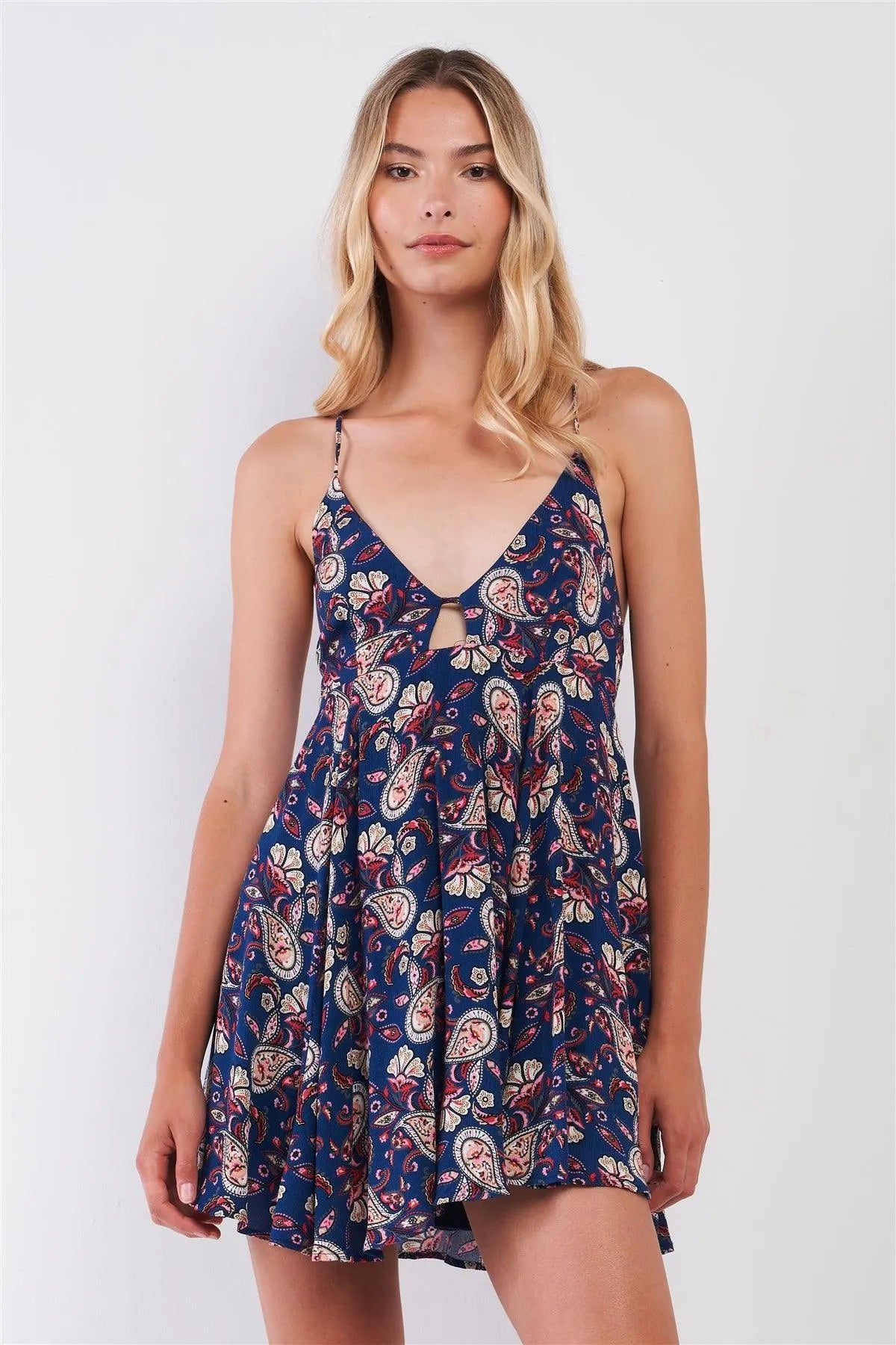 🖤Item Features: Navy multicolor, sleeveless, paisley print allover, V-neckline, self-tie criss-cross back straps, adjustable back straps' length, cut-out front detail, mini length, lined, slight stretch, non-sheer, casual, boho, light, spring/summer collection
