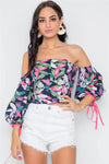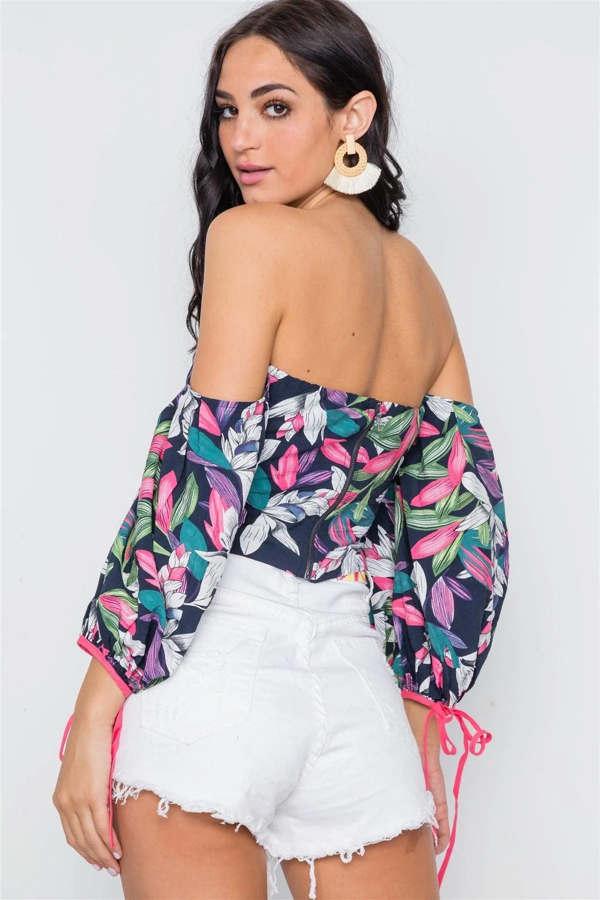 Top features: Off-The-Shoulder, puff sleeves with self tie strings at cuffs, support wire at bust, tropical leaves print allover, back zip closureModel is 5'8 and wearing Small (Waist: 24", Bust: 32A, Hips: 34")Item Measurements: Length: 11", Bust: 32" Sleeves: 14"True to size