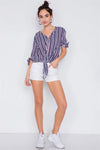 Top features: 3/4 sleeve tie, high-low, front center self tie, blue white and pink stripes, v-neck, front button detail, cinch pleated back, lightweight, blouse, chic, office, drop shoulder, semi-sheer, classy, boho, cinched shoulder, unlined, very stretchy. Model is 5'9" and wearing a Small (Waist: 24", Bust: 33B", Hips: 36")Size Small measurements: Length: 26" , Bust: 40" Sleeve: 13"True to Size