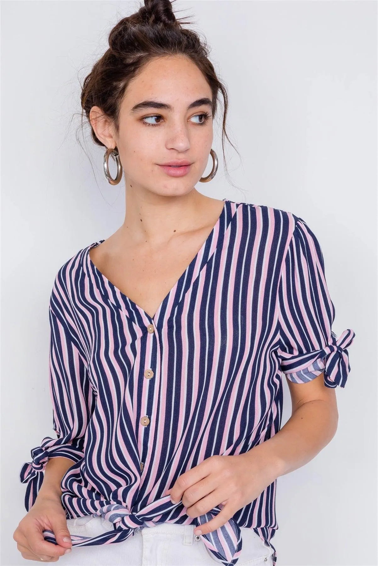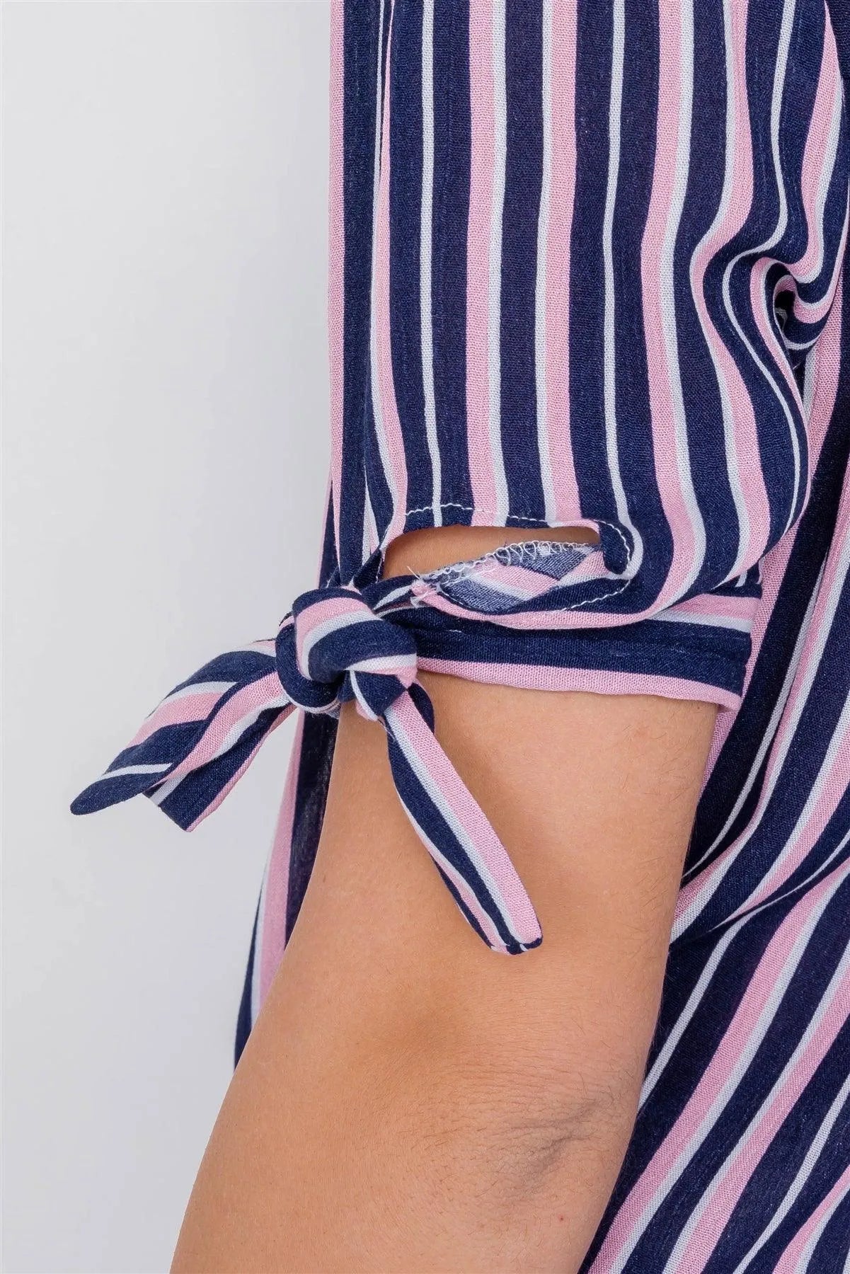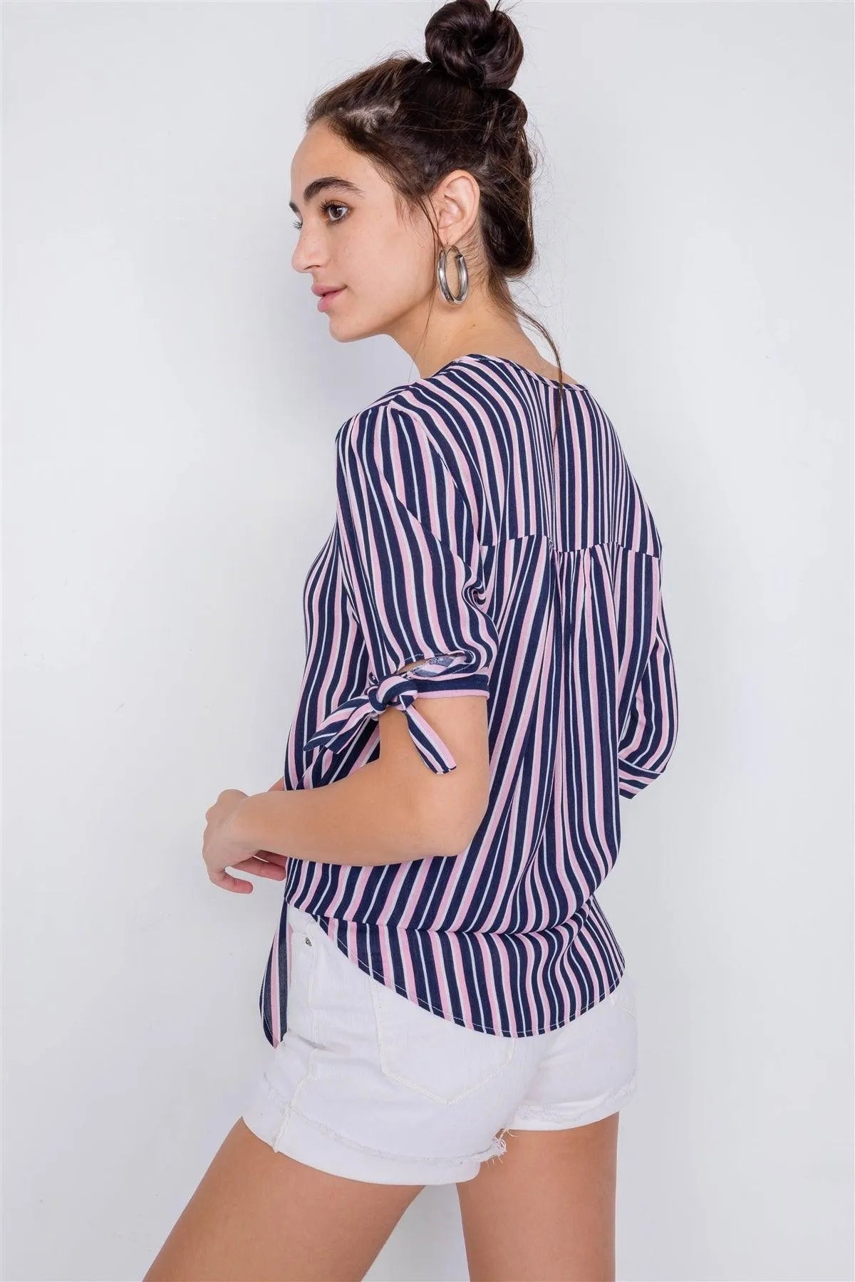 Navy & Pink Stripe 3/4 Sleeve Tie Cuff Office Chic Blouse /3-2-1