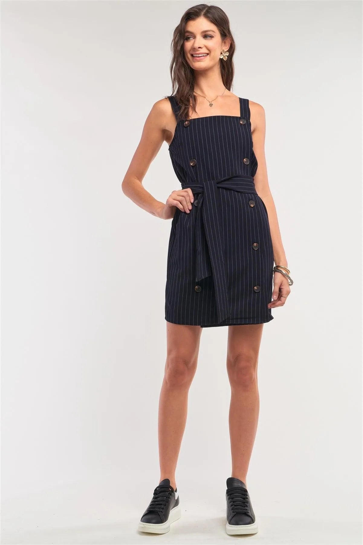 🖤 Item features: Navy, pinstripe print, sleeveless, square neckline, non-adjustable shoulder straps, double breasted button down front, fitted waistline with belt loops, detachable self-tie belt, unlined, fitted, semi-stretch, mini length, casual, business casual, office wear, back-to-school vibe, stylish, fall/winter collection